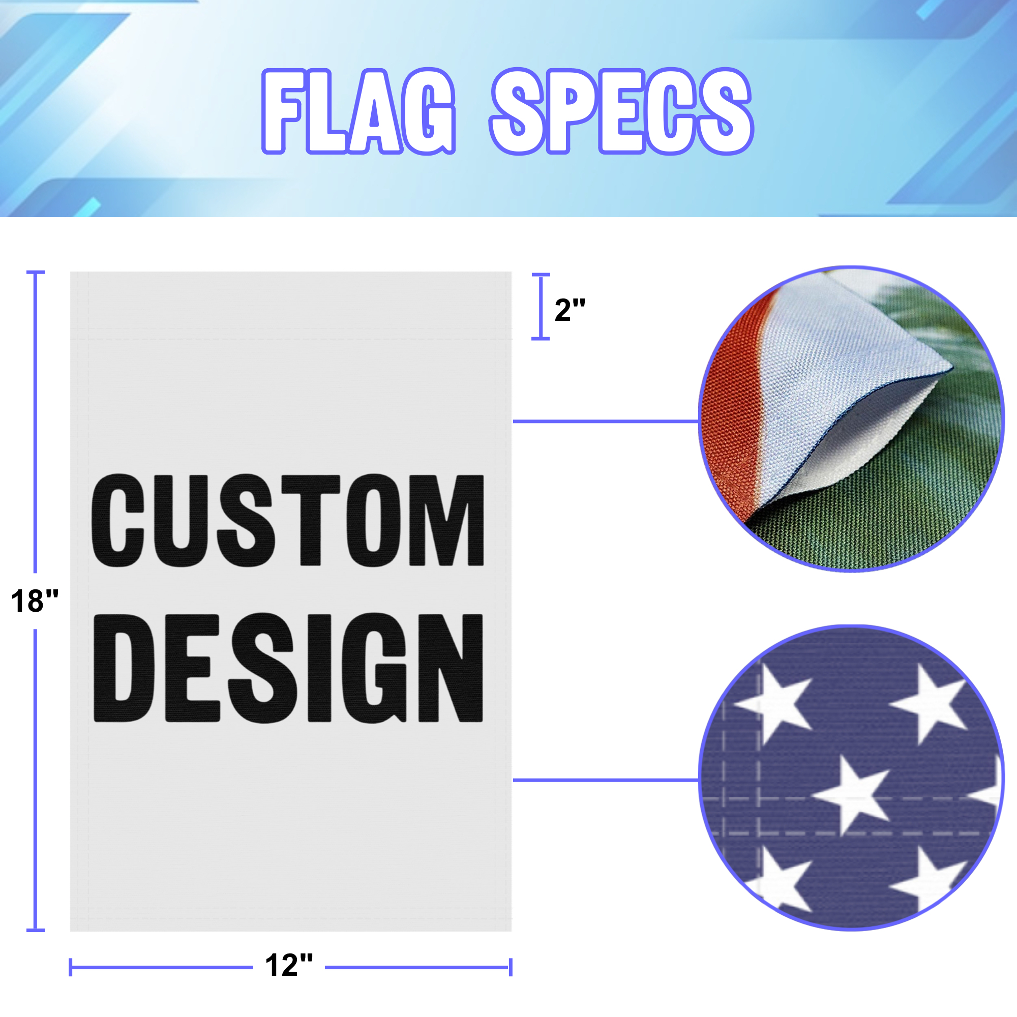 Nuestra bandera de jardín personalizada está diseñada para causar un impacto visual impactante en cualquier jardín, patio o espacio exterior. Sus dimensiones compactas garantizan una proporción perfecta para astas estándar o exhibiciones de pared sin sobrecargar el espacio.