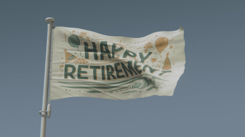 Celebra los momentos especiales y los hitos de la vida con la bandera "Feliz Jubilación" . Esta llamativa bandera es perfecta para destacar tu celebración, evento o mensaje.
