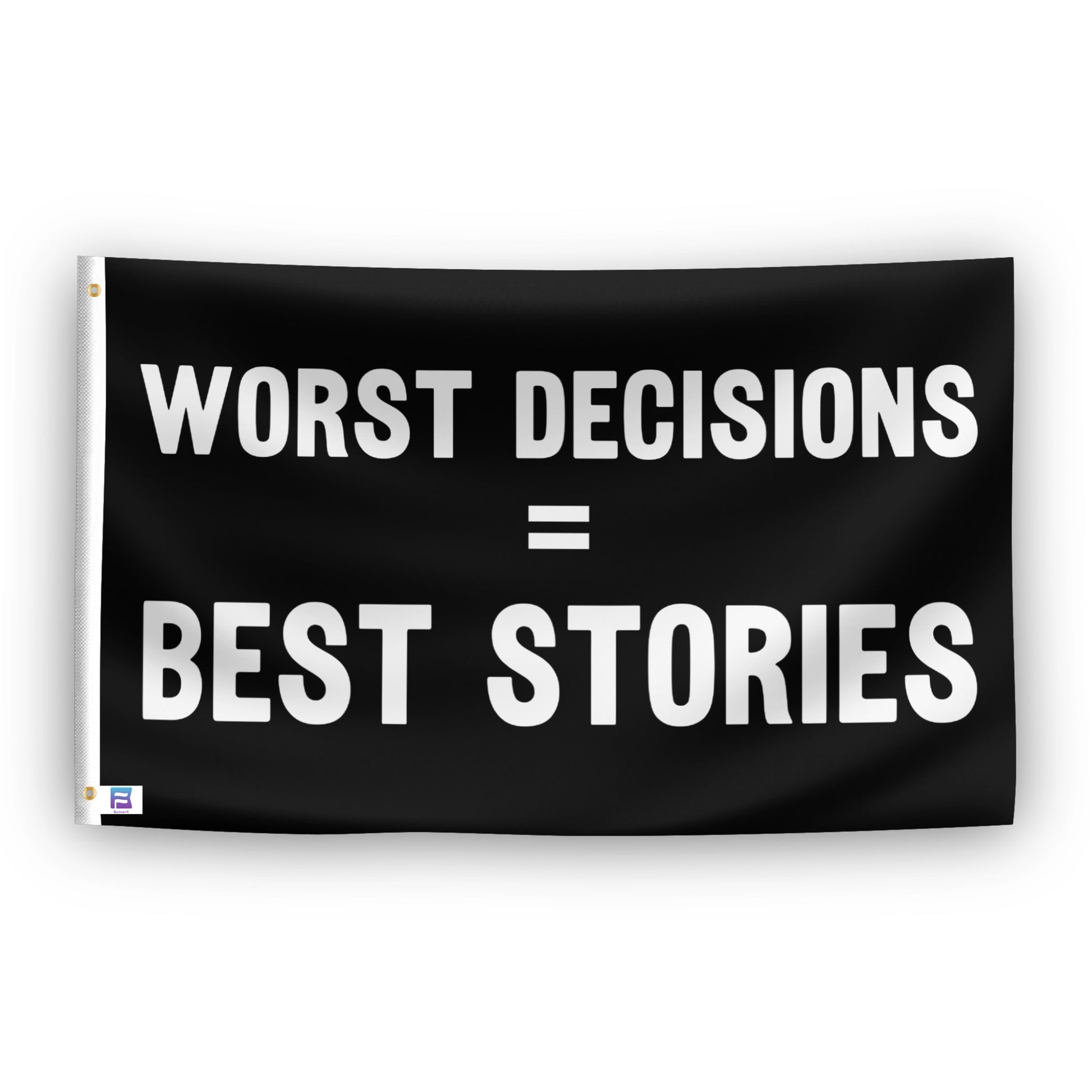 Turn heads at your next gathering with a flag that turns bold decisions into memorable stories—the Worst Decisions Equal Best Stories Flag. This playful drinking flag, meme flag, and party flag is perfect for parties, game nights, or backyard hangouts, instantly setting the vibe and sparking laughter.