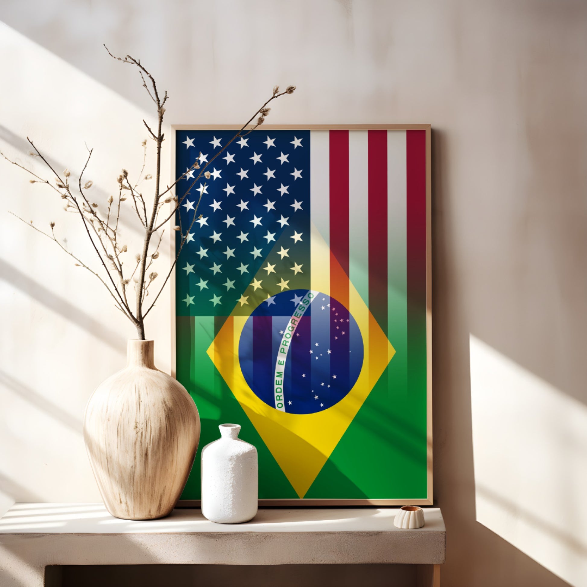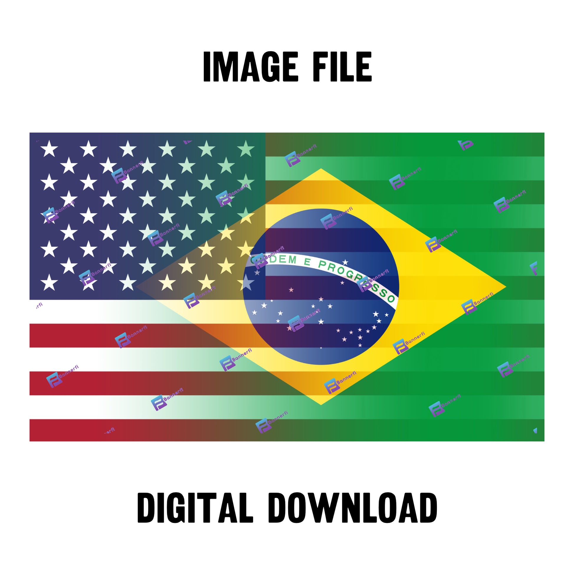 Celebrate dual heritage with a bold digital artwork that fuses the United States flag with Brazil's iconic emblem. Delivered as a ready-to-use JPEG from Bannerfi, this design is perfect for posters, prints, social graphics, and more.