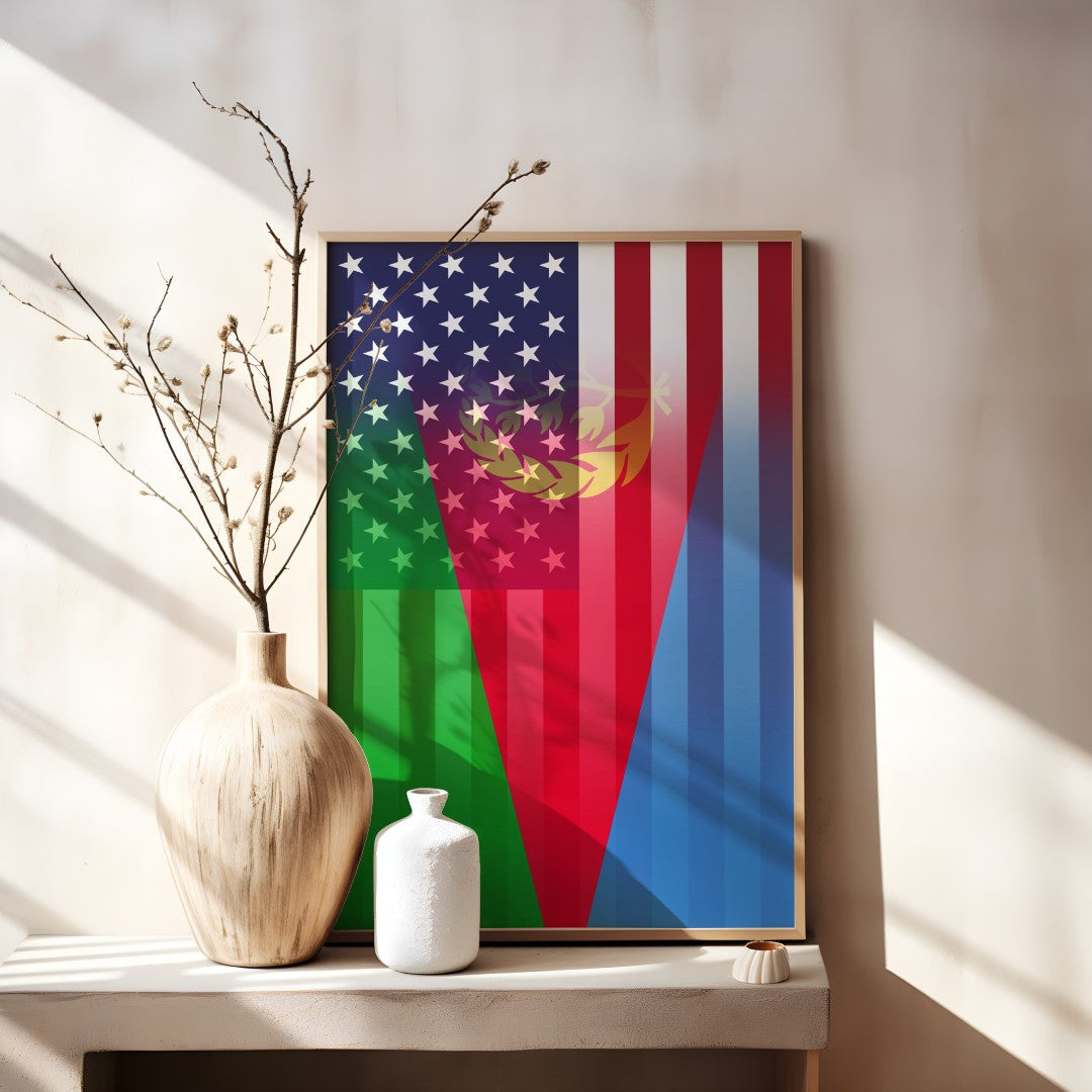Honor your Eritrean and American roots with a digital artwork that blends the United States flag's stars and stripes with the Eritrean emblem. Ideal for digital art lovers, educators, and anyone celebrating dual heritage, this high-impact design is ready to elevate posters, prints, and social graphics.