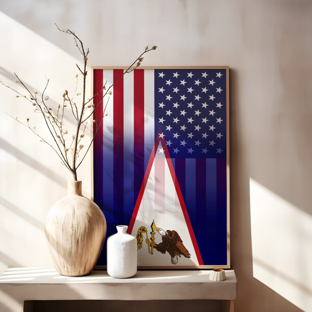 From Bannerfi, the Samoa & American Flag Design Download blends the U.S. stars & stripes with the bold design of the Samoa state flag into a single, striking digital artwork. Perfect for posters, apparel prints, web banners, hats, and more, this versatile file is ready to elevate your patriotic projects.