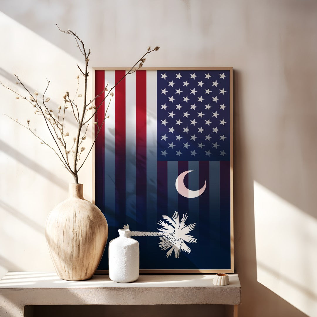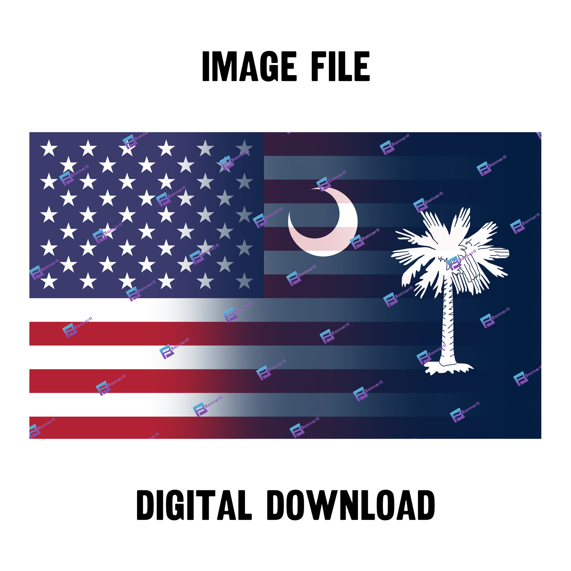 Show your pride with a bold digital artwork that seamlessly blends the U.S. Stars & Stripes with the South Carolina state flag. Designed for patriotism-inspired posters, apparel prints, banners, and more, this high-quality design is a versatile asset from Bannerfi.