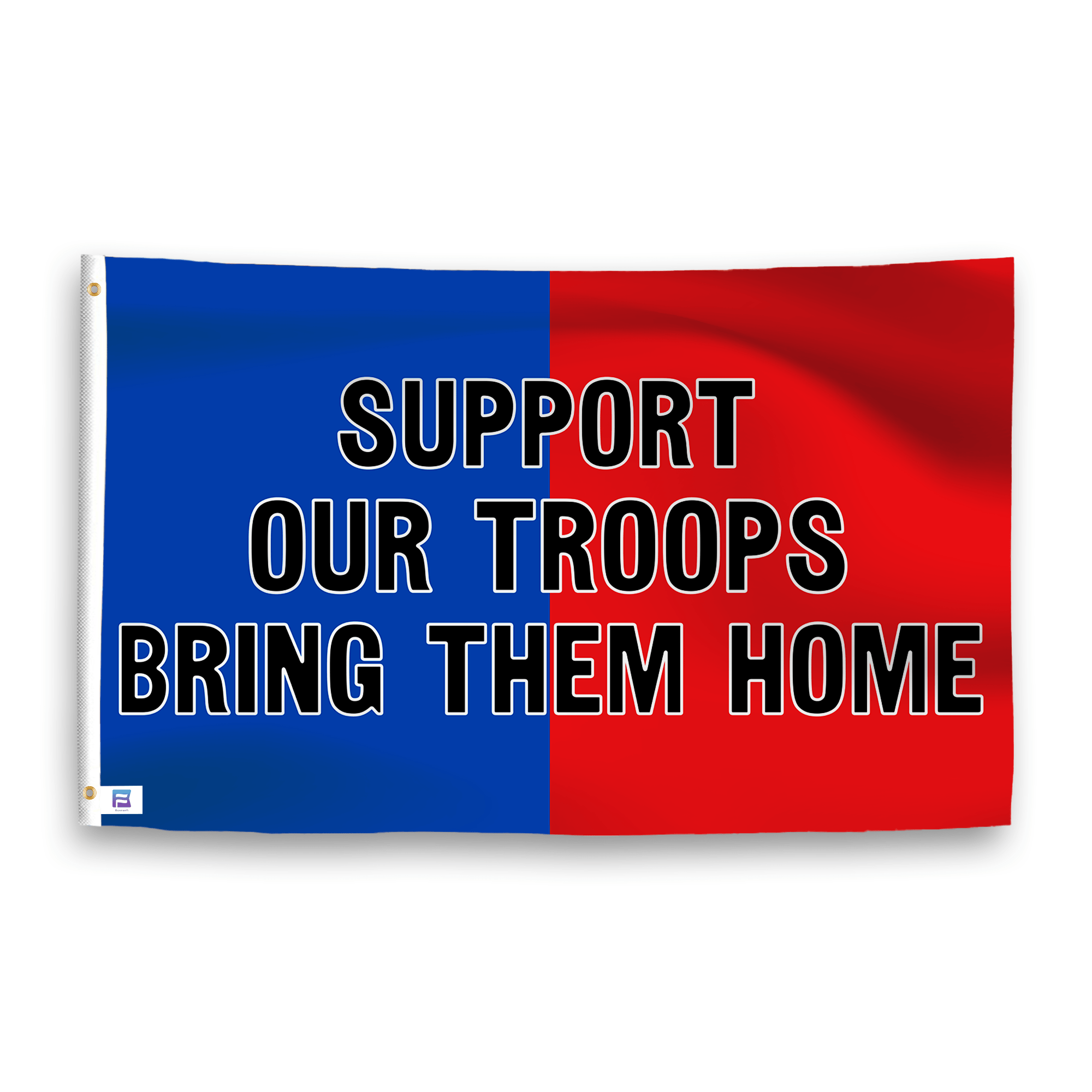 Affichez votre soutien avec le drapeau « Soutenons nos troupes, ramenons-les à la maison » ! Ce drapeau accrocheur est parfait pour exprimer vos opinions politiques, que vous soyez démocrate ou républicain.