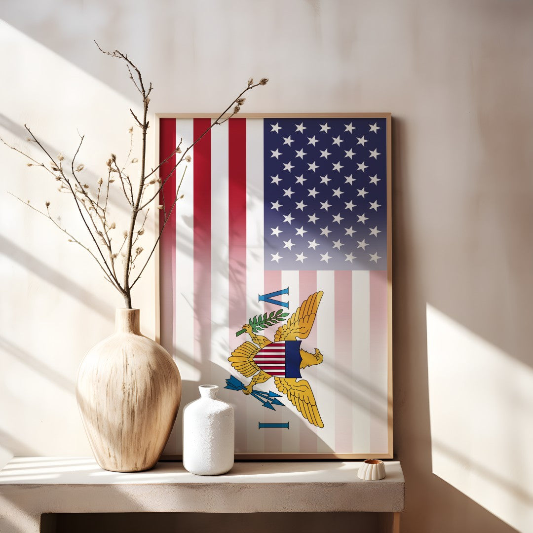 - Design: Seamless fusion of the U.S. flag elements with the Virgin Islands state flag emblem