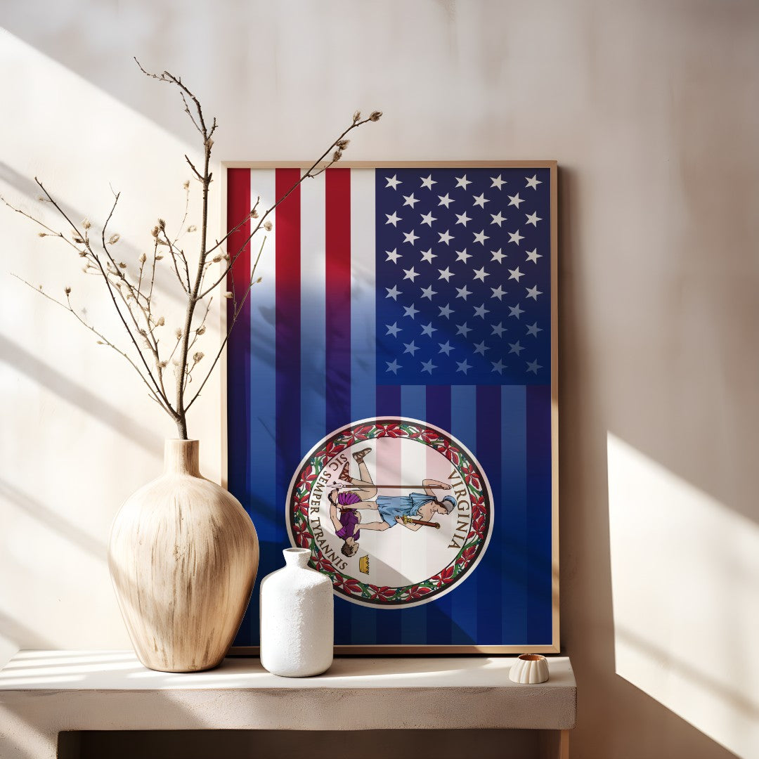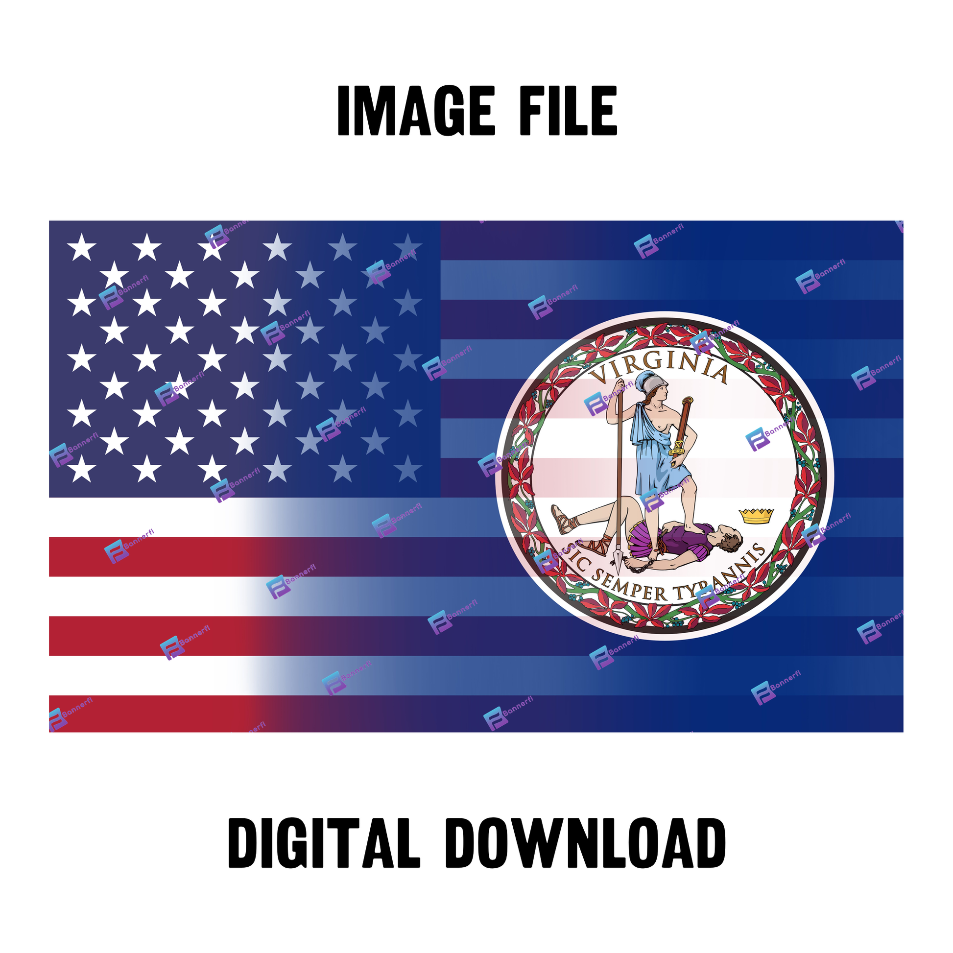 Celebrate pride with a bold digital artwork that seamlessly blends the U.S. stars and stripes with the Virginia state seal. Designed for creators and brands, this versatile design is perfect for posters, apparel prints, web banners, hats, and more—and it’s available as an instant download from Bannerfi.