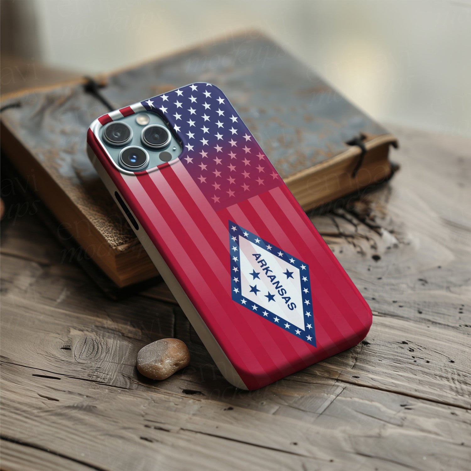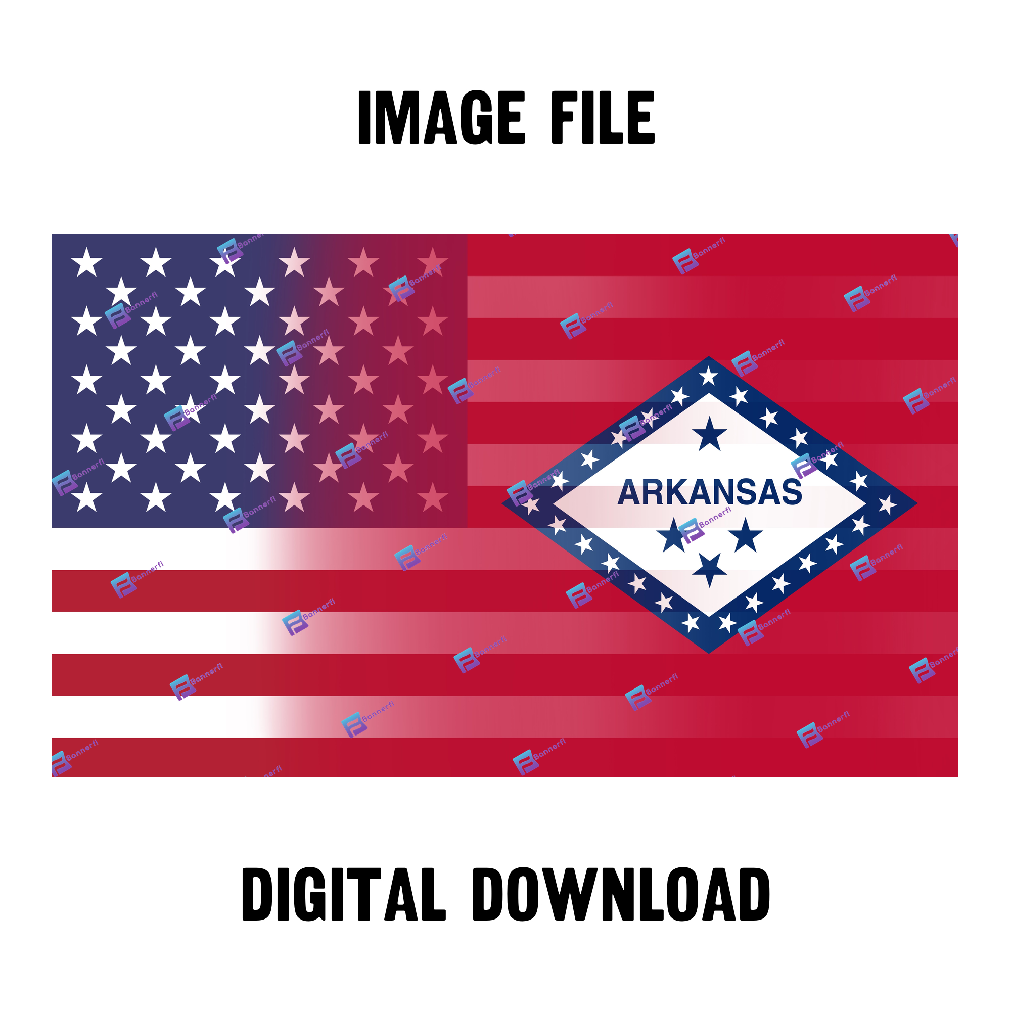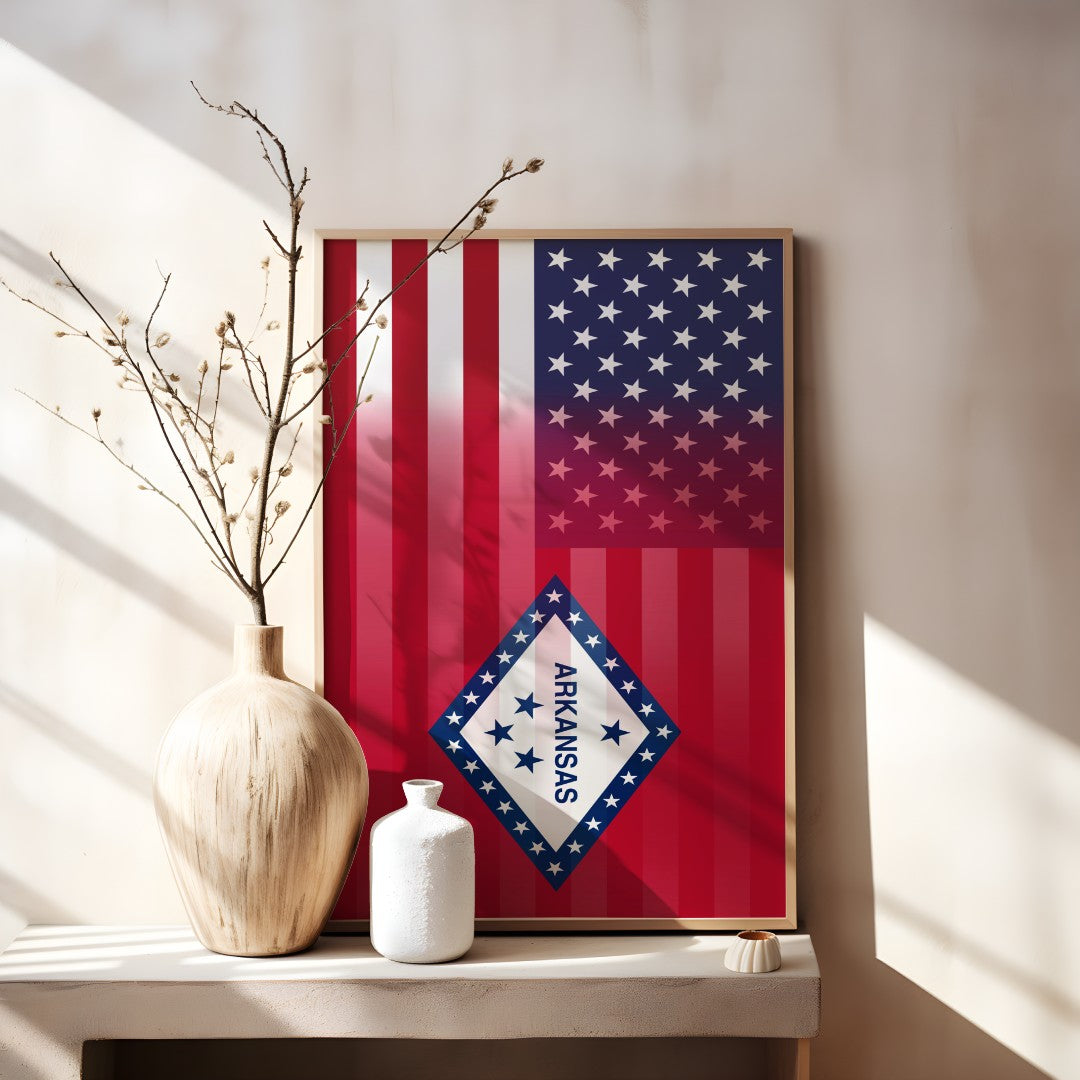 This digital artwork merges the U.S. stars-and-stripes with the Arkansas state flag into a single, bold design. Ideal for designers, marketers, and creators who want a cohesive patriotic motif for posters, apparel prints, banners, and more.
