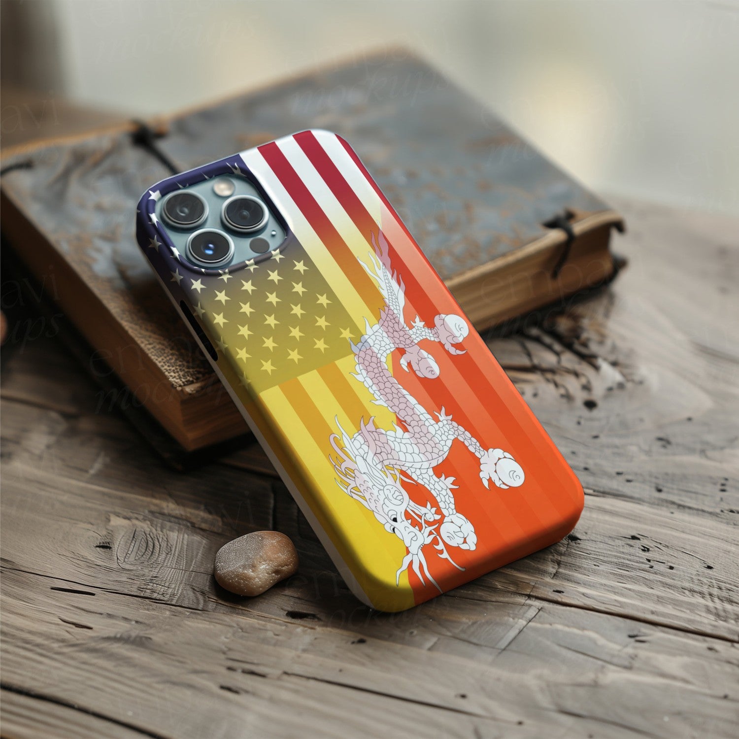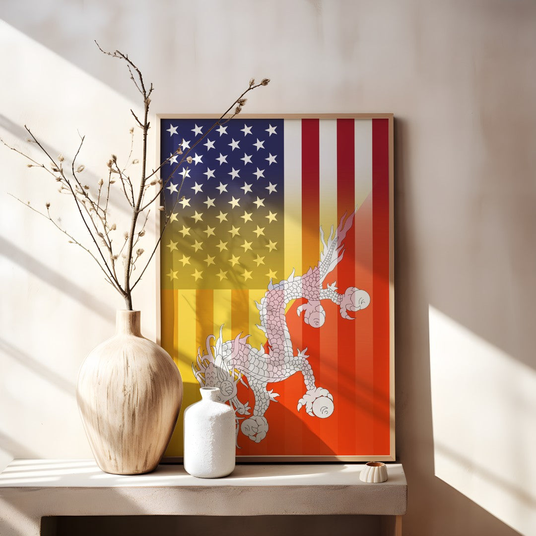 - Design elements: seamless fusion of the US flag palette with the Bhutia emblem and dragon motif