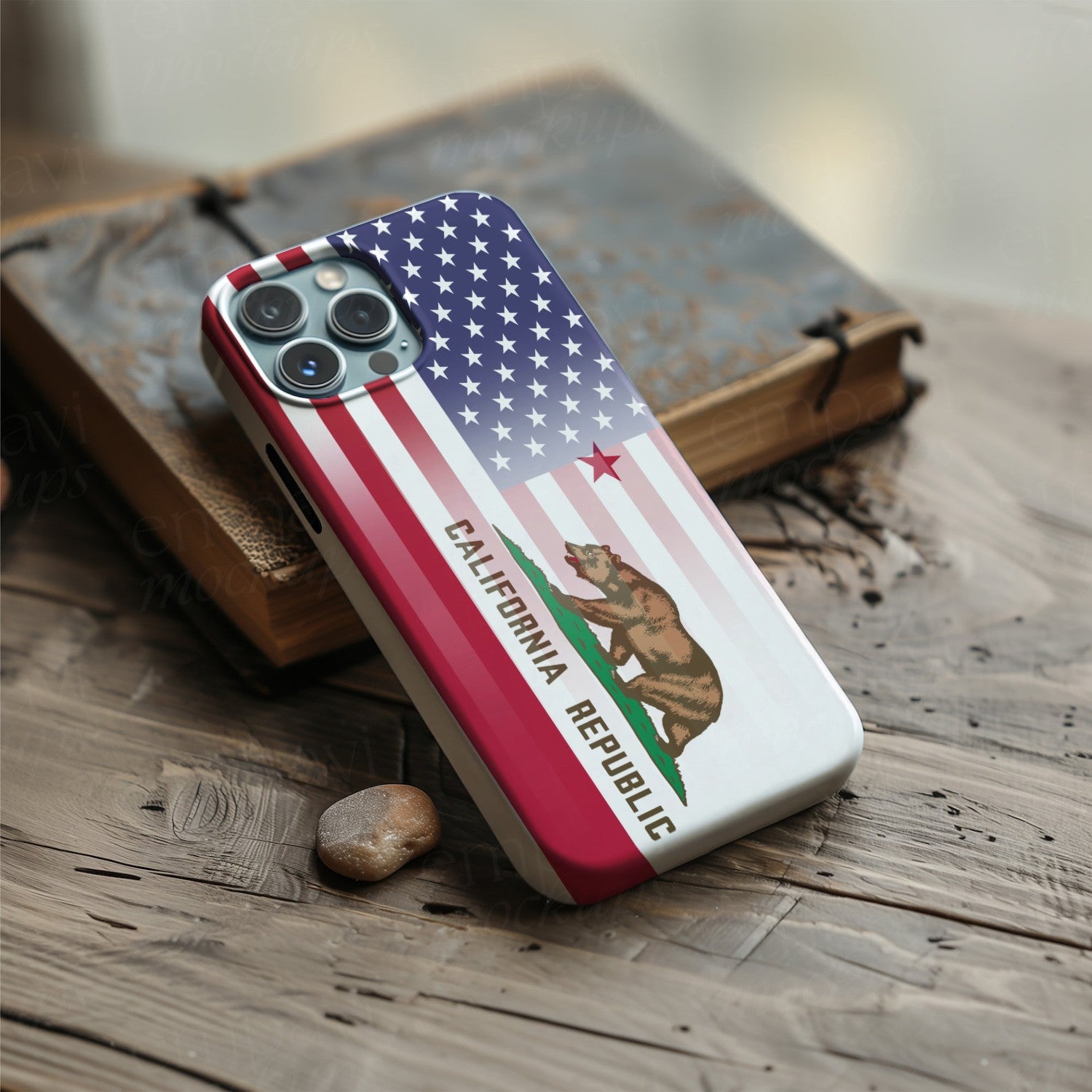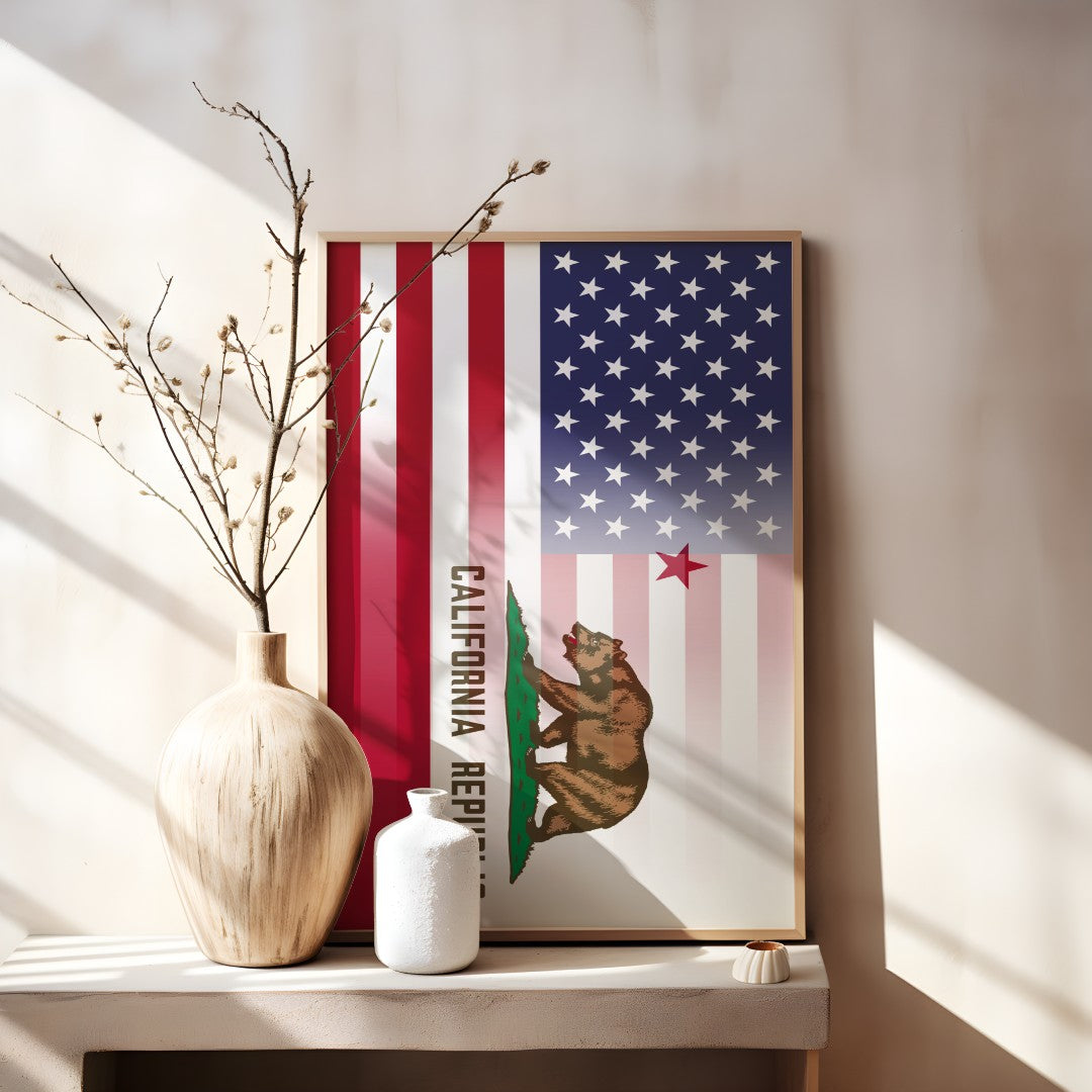 - Subject: Seamless fusion of the United States flag with the California state flag in a single cohesive design