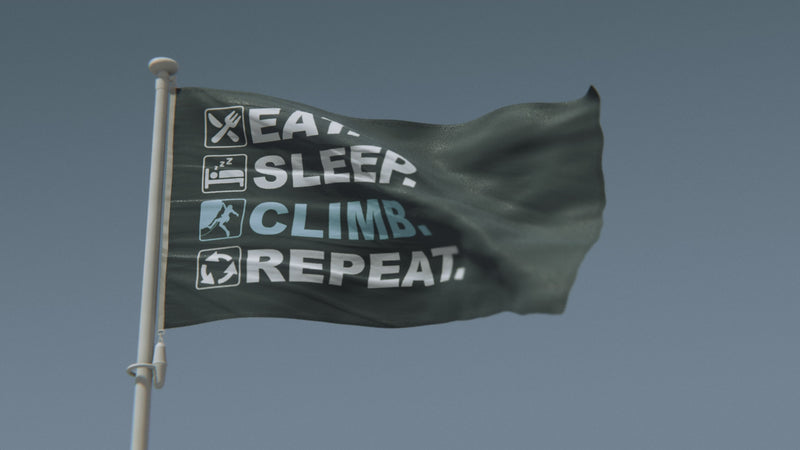 Celebrate your climbing passion with the Eat Sleep Climb Flag—a durable outdoor flag designed for homes, gyms, and outdoor spaces. The design stands out on a sleek black field with bold white typography and a blue accent on “CLIMB.”, making your hobby visible from every angle.