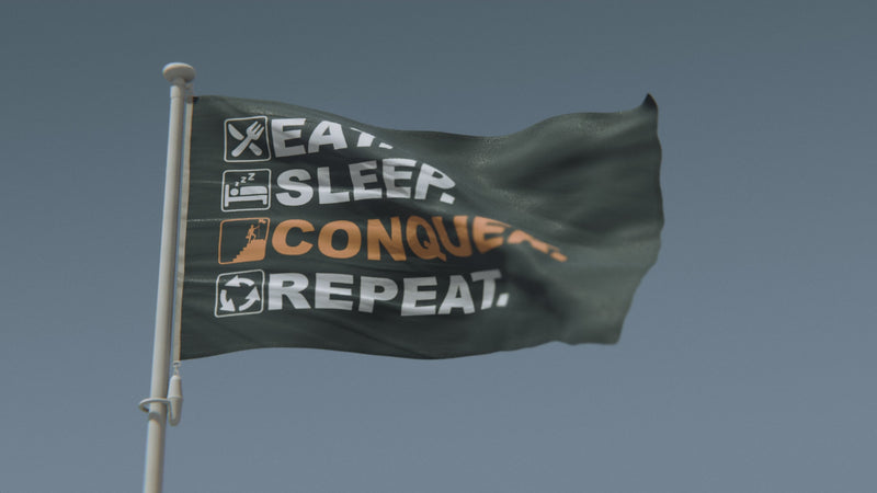 Meet the Eat Sleep Conquer Repeat Flag from Bannerfi — a bold polyester flag crafted for fans of hobbies, motivation, and personal flair. Whether displayed on a wall, a yard flagpole, or at an event, this flag makes a clear statement about your everyday drive and passions.