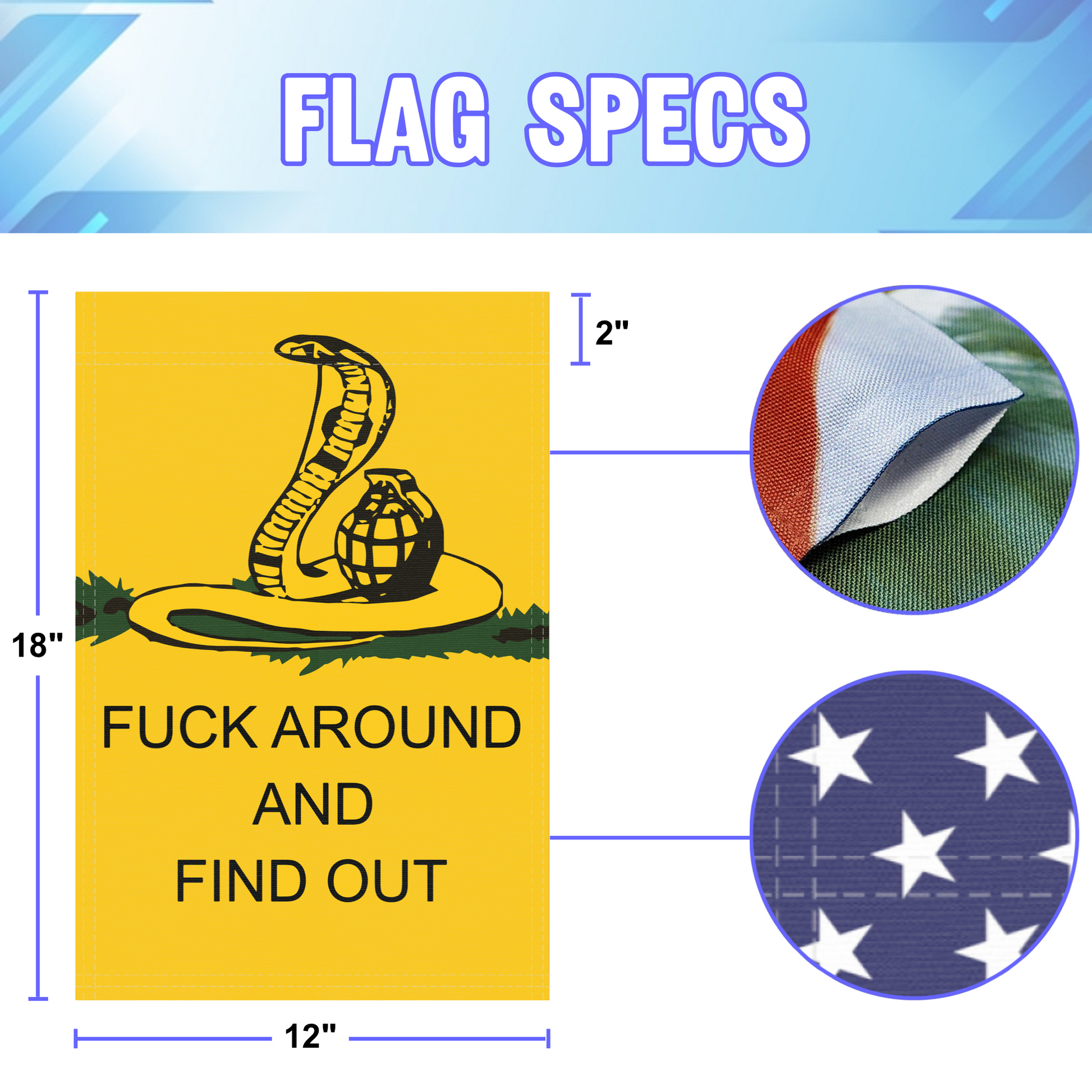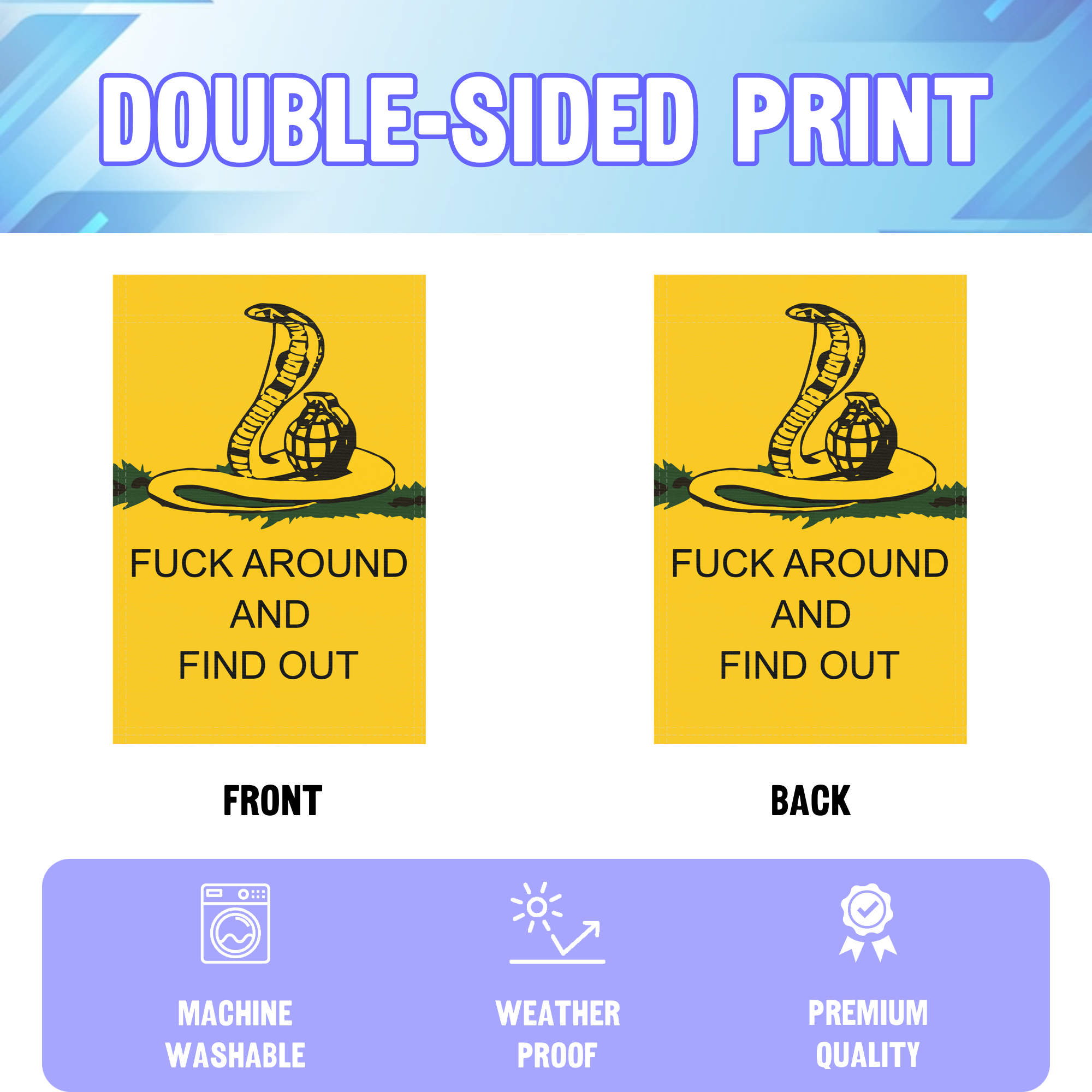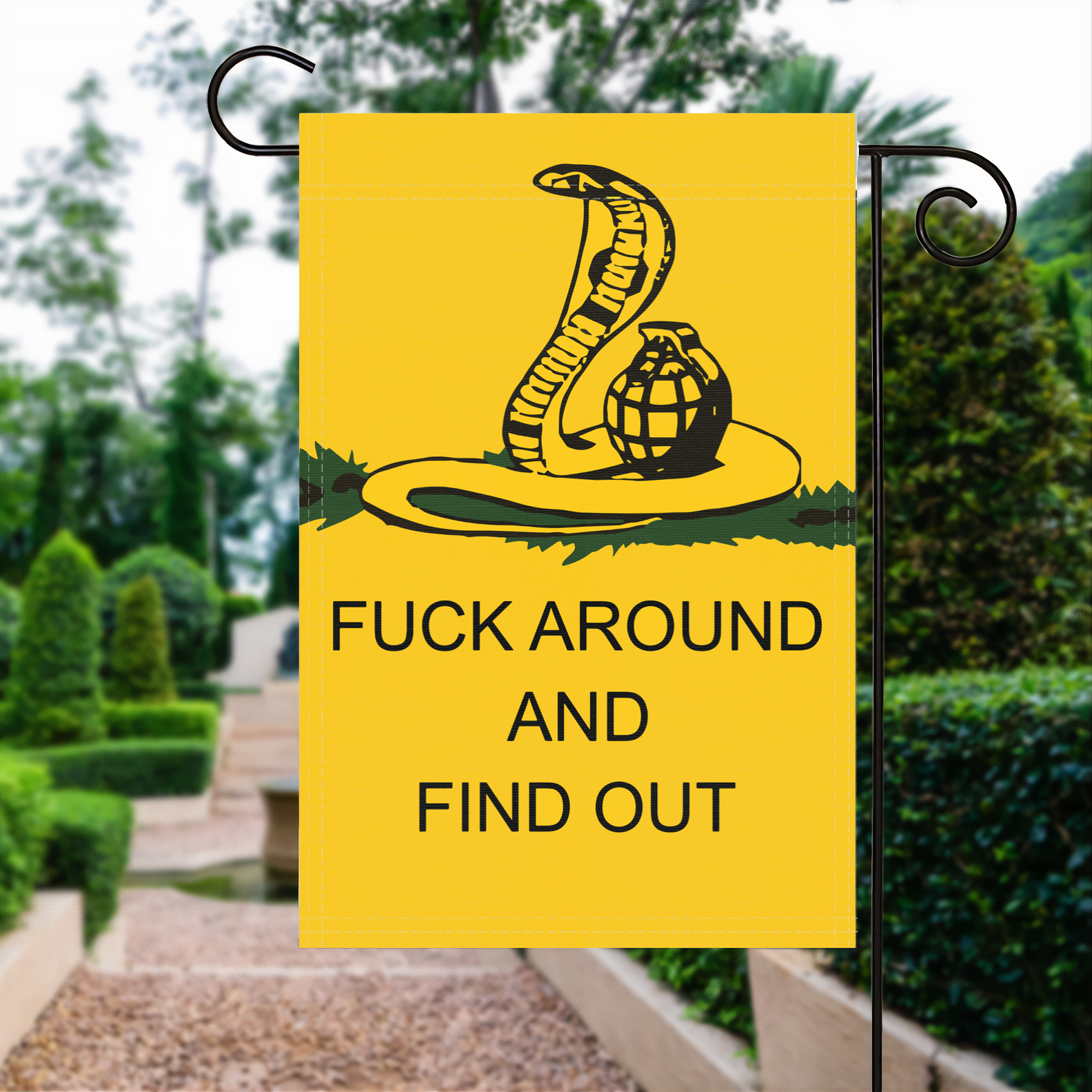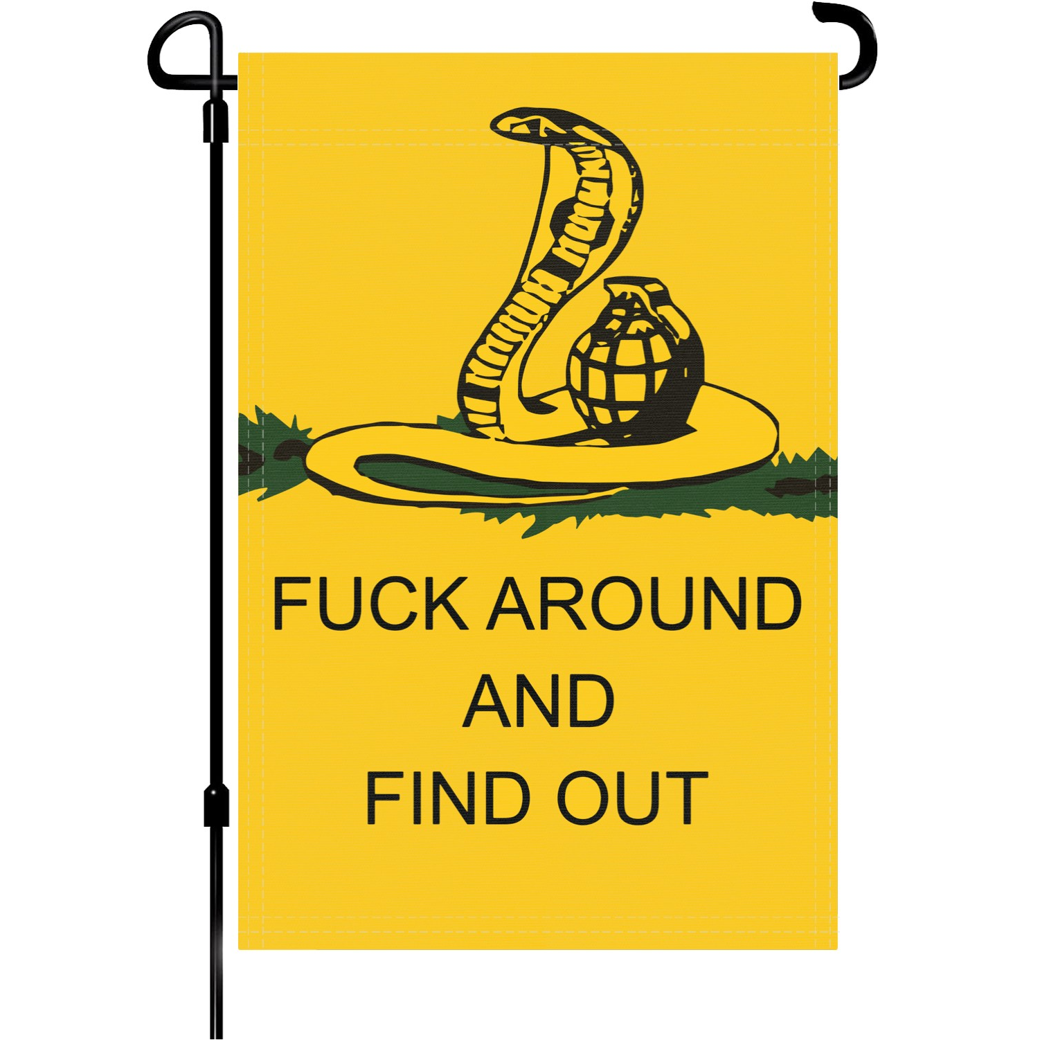 Express your bold attitude with the F**k Around And Find Out (Snake) Meme Garden Flag — a playful, meme-inspired outdoor décor piece from Bannerfi. Sized at 12x18 inches, it’s the perfect accent for a yard, garden, or patio and is built to keep the message vibrant through rain, sun, and wind from every angle.