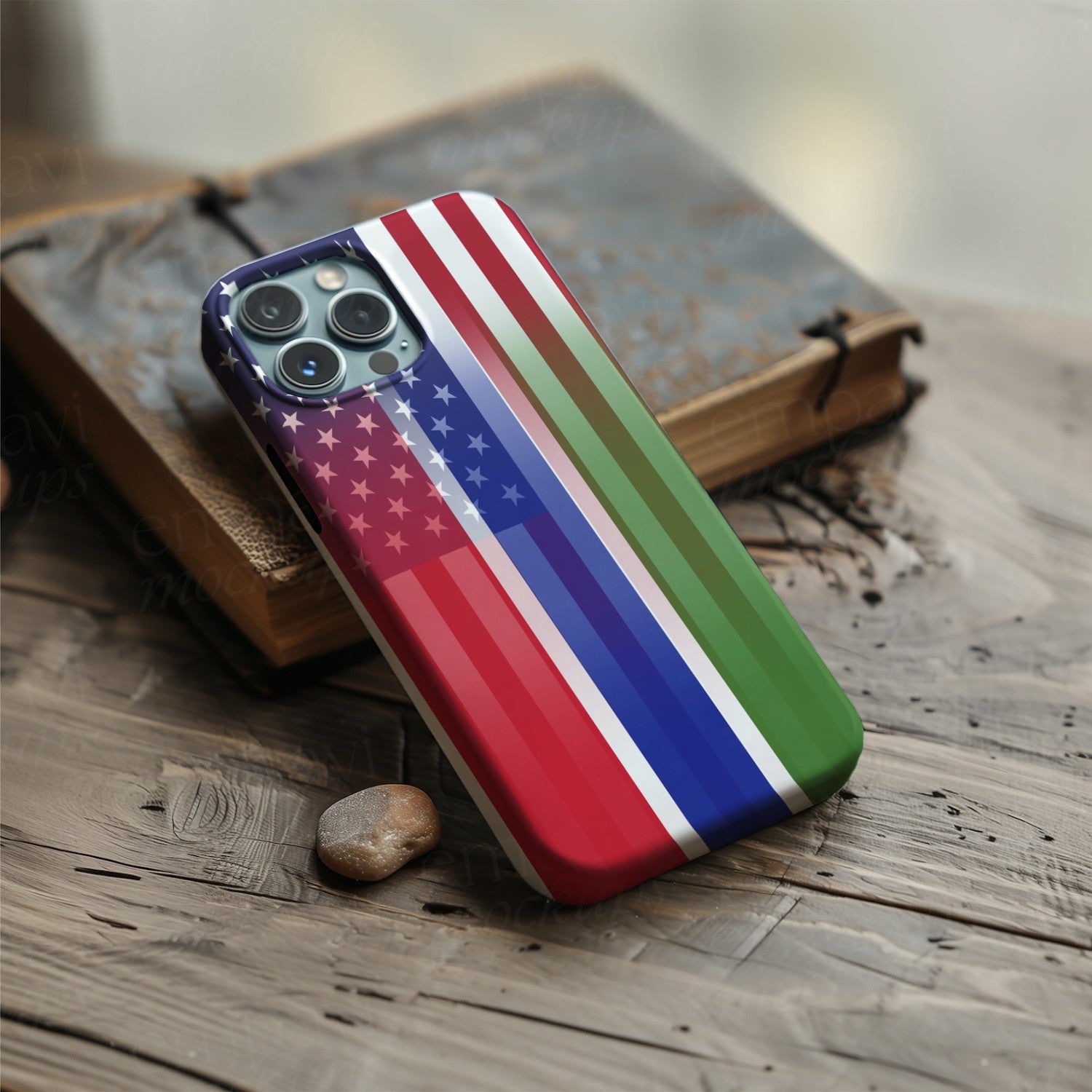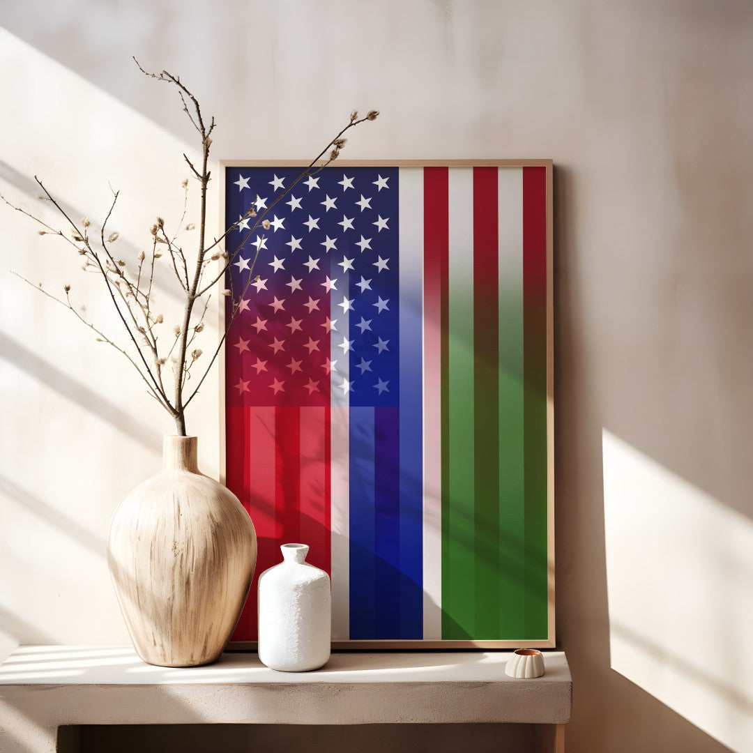 Celebrate dual heritage with a bold digital artwork that merges the United States stars and stripes with the Gambian flag into a single, striking design. Perfect for posters, prints, social graphics, and other digital projects that honor cultural unity with style.