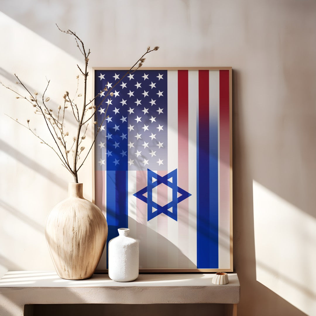 Celebrate dual heritage with a striking digital artwork that blends the United States flag with a bold Israeli emblem. Perfect for posters, prints, social graphics, and a variety of creative projects, this ready-to-use design brings a unique, patriotic statement to any setting.