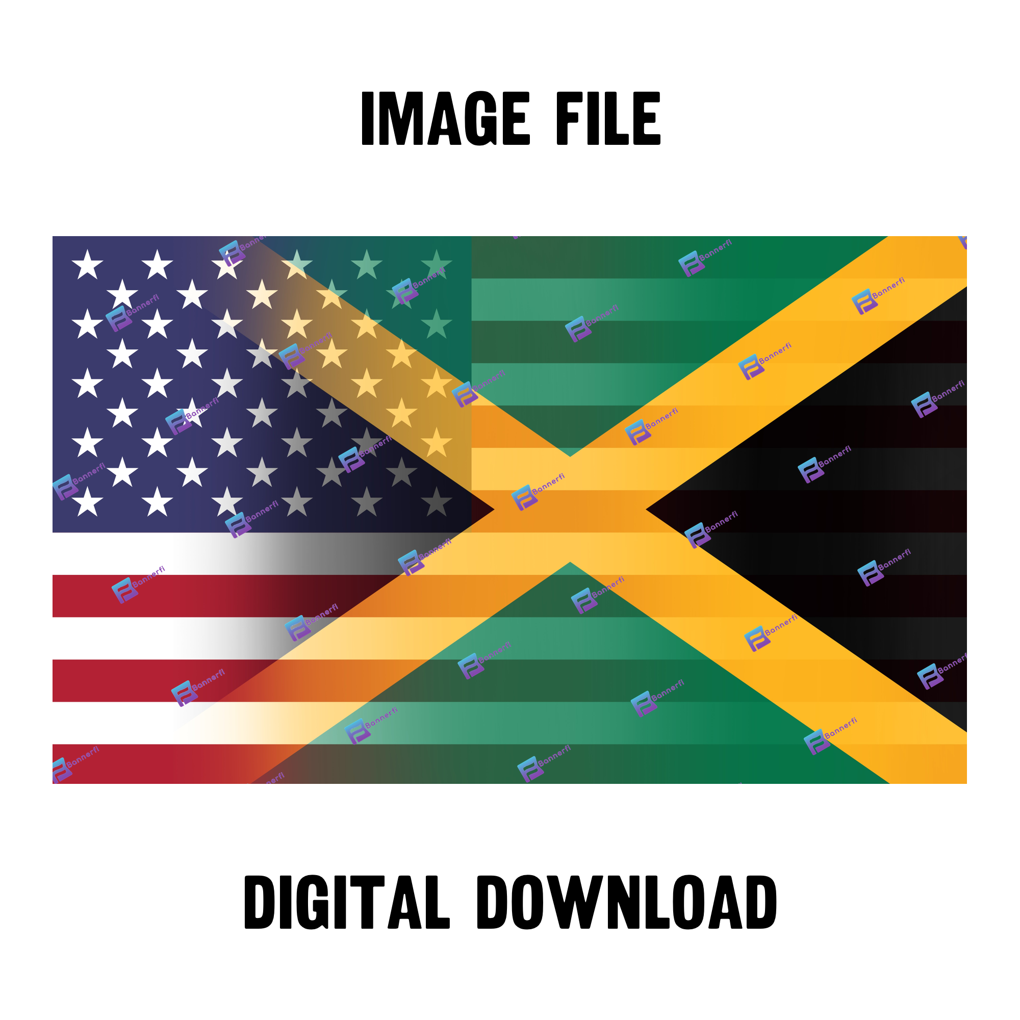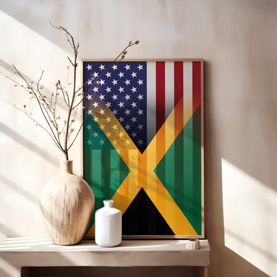 Celebrate dual heritage with a bold digital artwork that fuses the United States flag with the Jamaican flag into a single, ready-to-use design. Perfect for posters, prints, social graphics, and a variety of creative projects that honor both cultures.