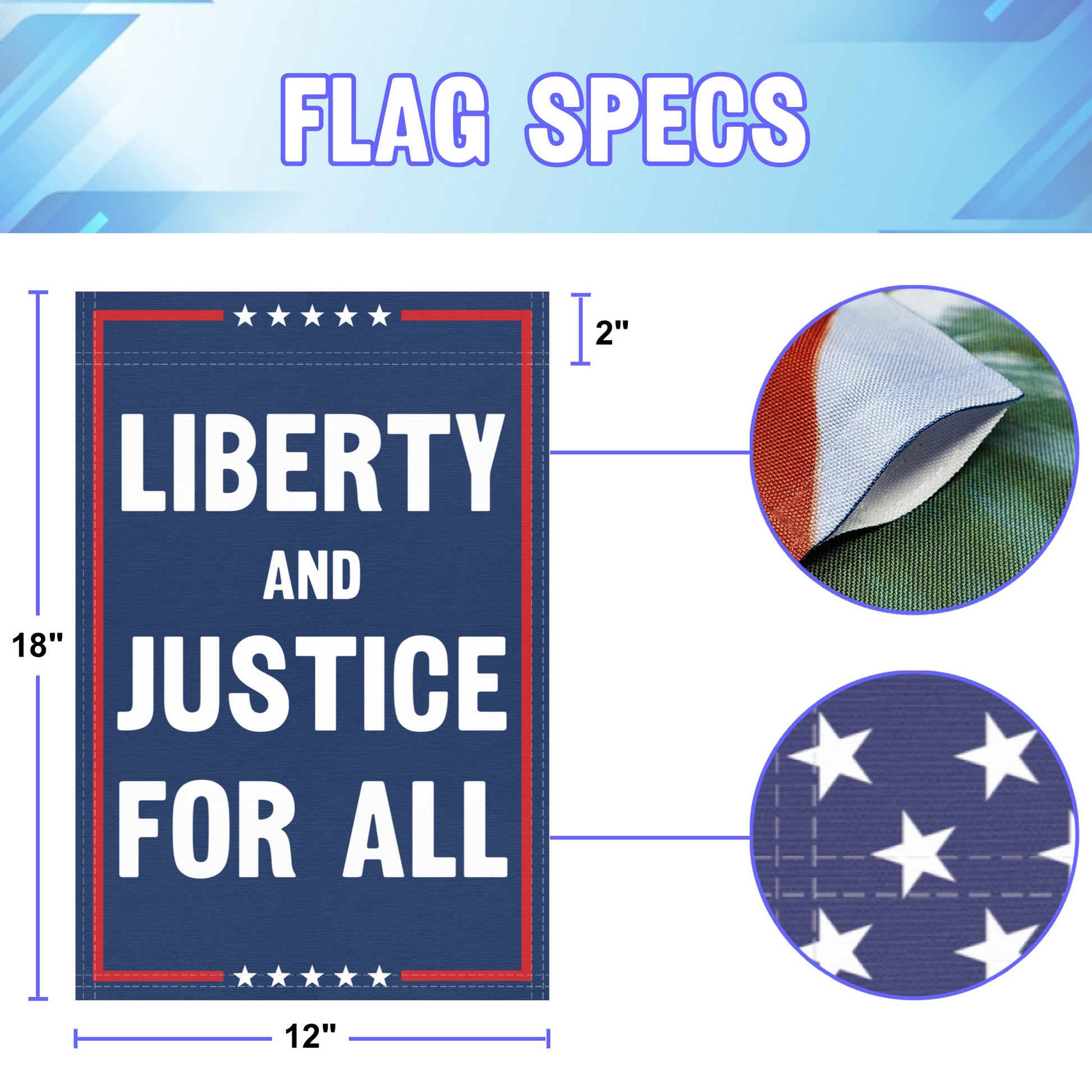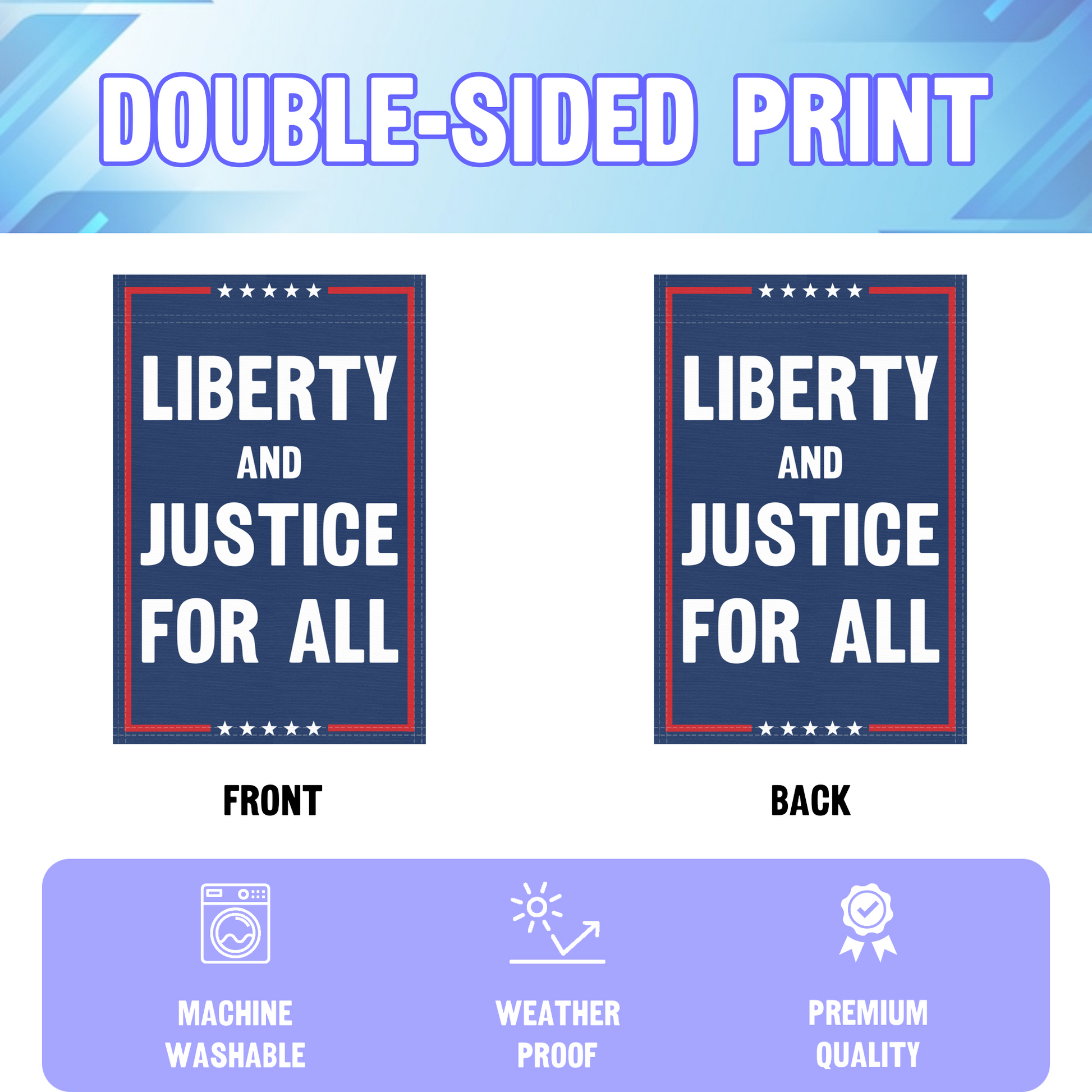 - Design: Blue field with bold white lettering, accented by a red border for a classic, patriotic look.