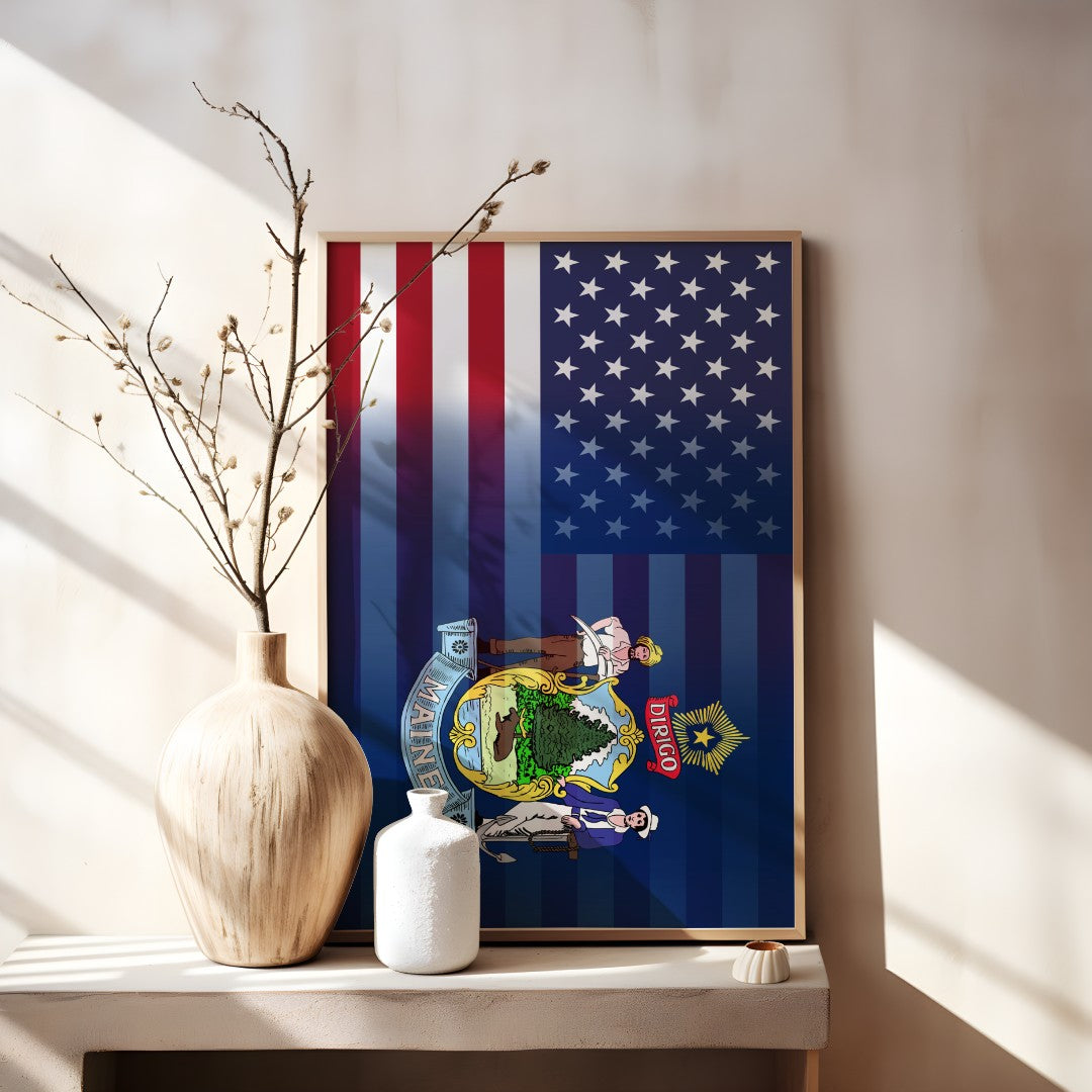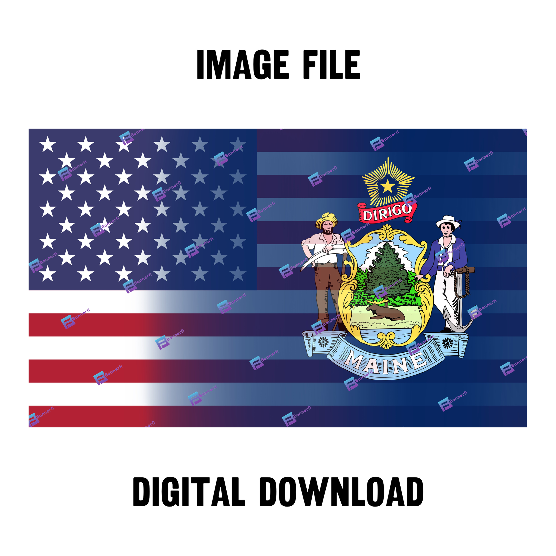 Introduce a bold statement of pride with Maine & American Flag Design, a high-resolution digital artwork that blends the United States flag motif with the distinctive Maine state flag. Perfect for posters, apparel prints, web banners, hats, and a variety of creative projects from Bannerfi.