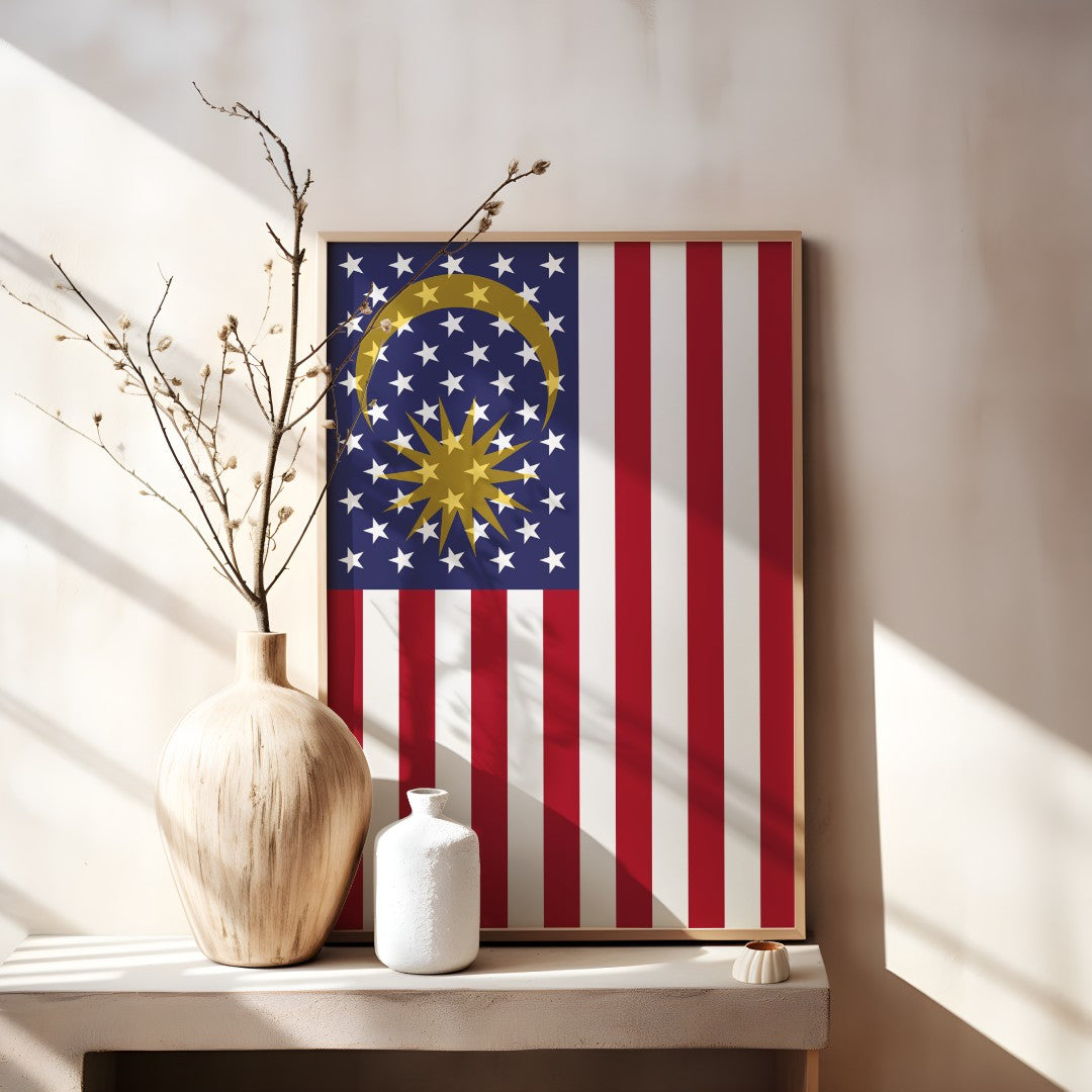 Celebrate dual heritage with a bold digital artwork that blends the United States flag’s energy with the iconic Malaysian emblem. This ready-to-use design is perfect for posters, prints, social graphics, and creative projects that honor cultural unity.