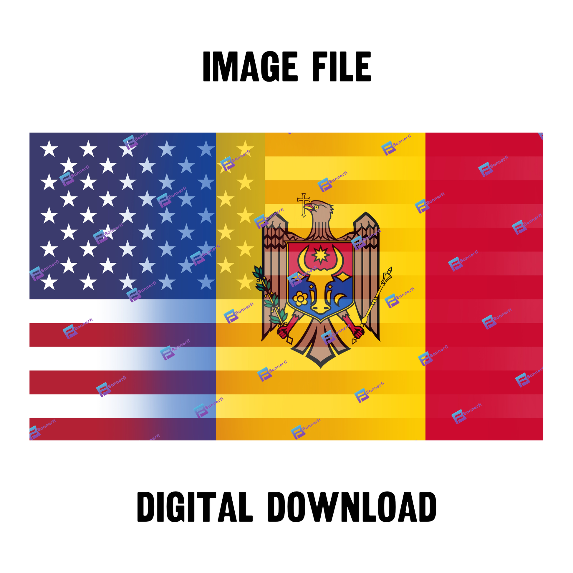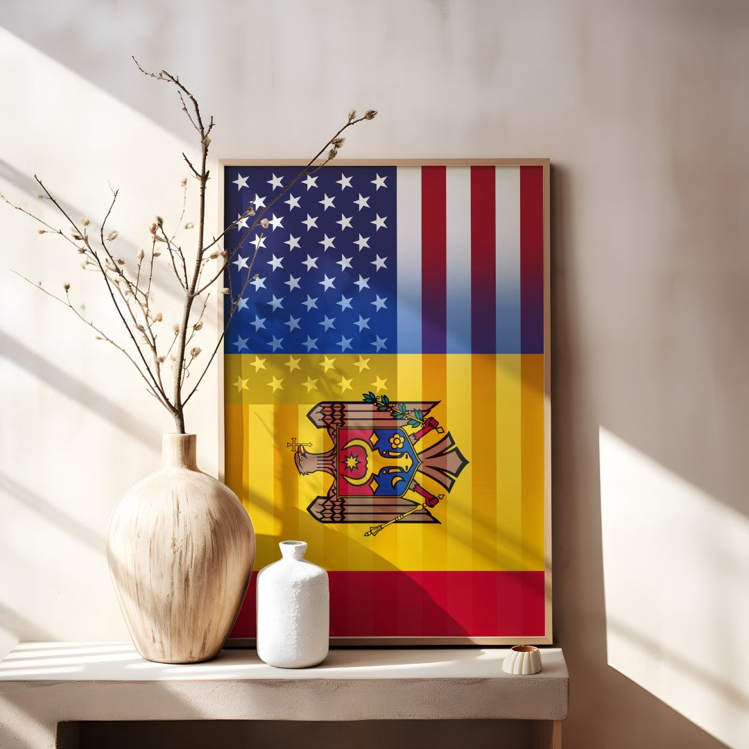 Celebrate dual heritage with a striking digital artwork that blends the United States stars and stripes with the Moldovan emblem in a single, cohesive design. Perfect for posters, prints, social-share graphics, and creative projects.