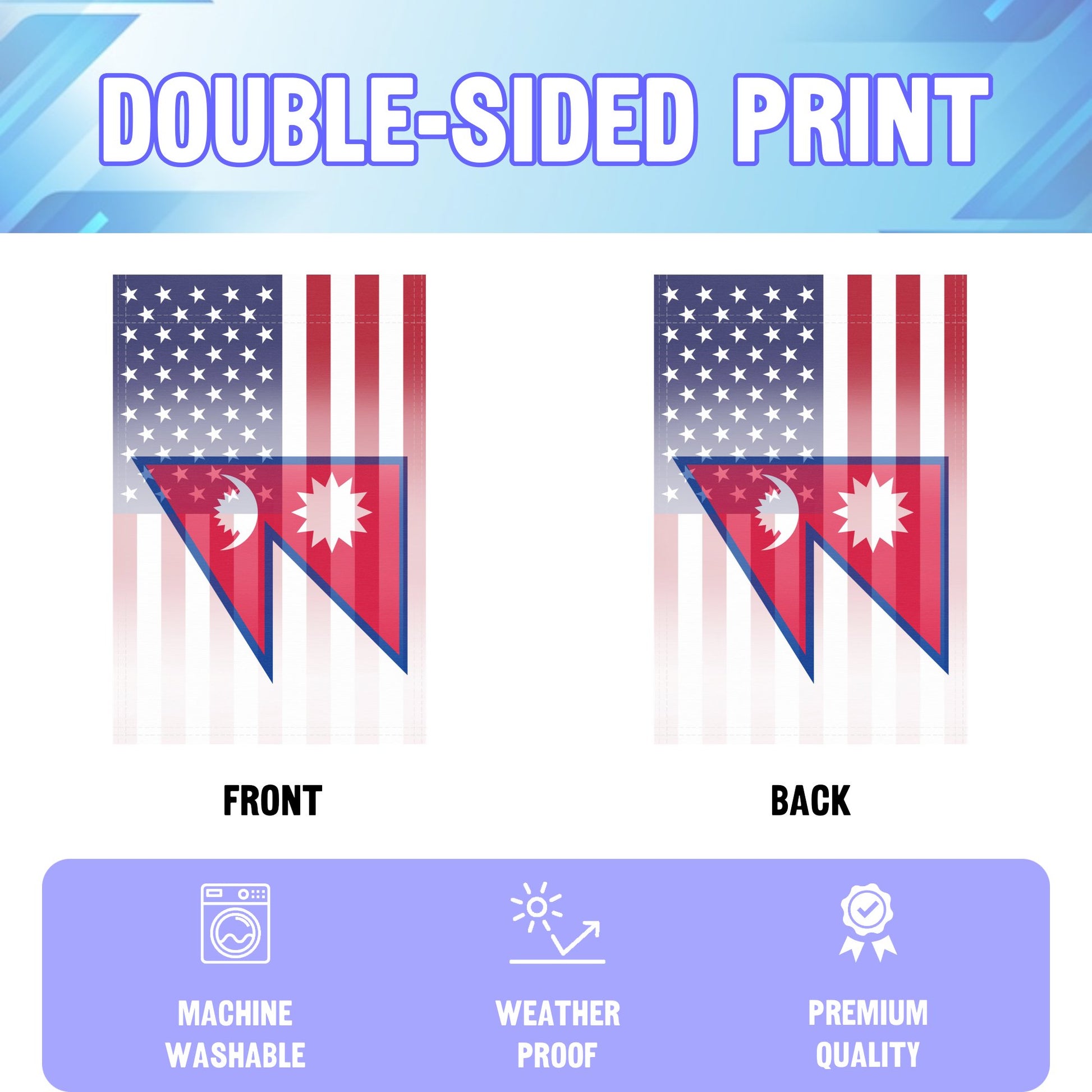 Category note: Home & Garden > Decor > Flags & Windsocks. Metafield highlights emphasize durable materials, outdoor suitability, and the flag’s role in celebrating Nepalese-American heritage. Perfect for national holidays and cultural events—a tasteful expression of pride in any yard.