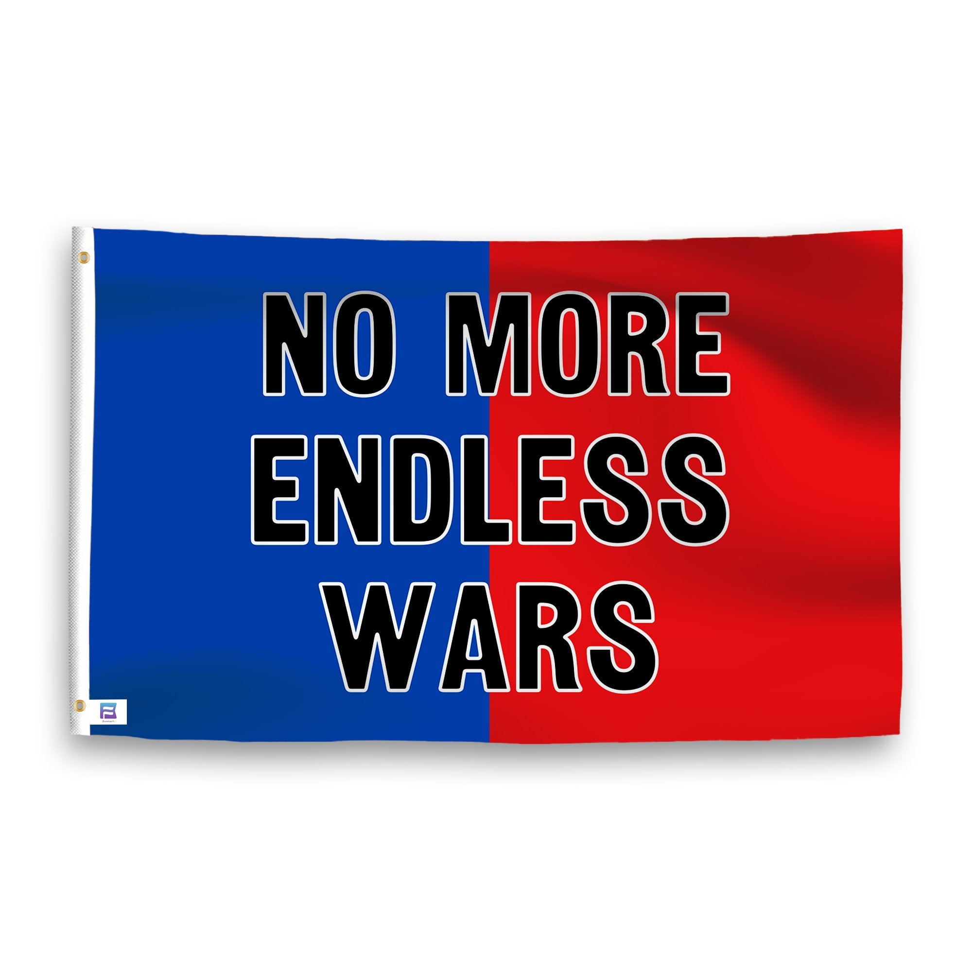 - Two-tone background with a blue left panel and red right panel, featuring a bold “NO MORE ENDLESS WARS” message