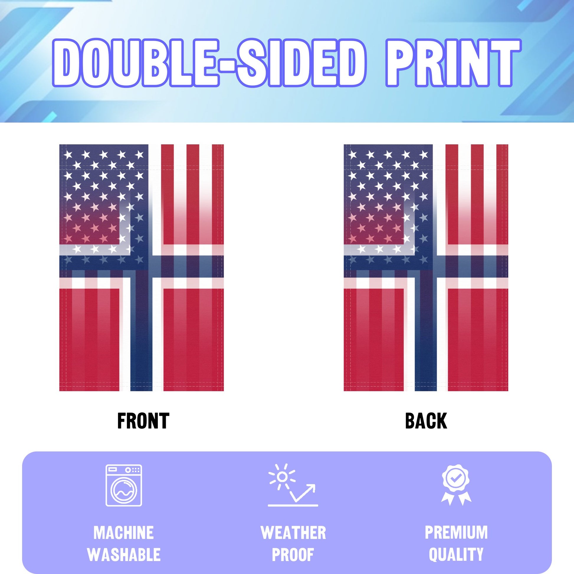 - Design: Double‑sided flag featuring a blended US and Norwegian motif, so the image remains crisp and visible from all angles