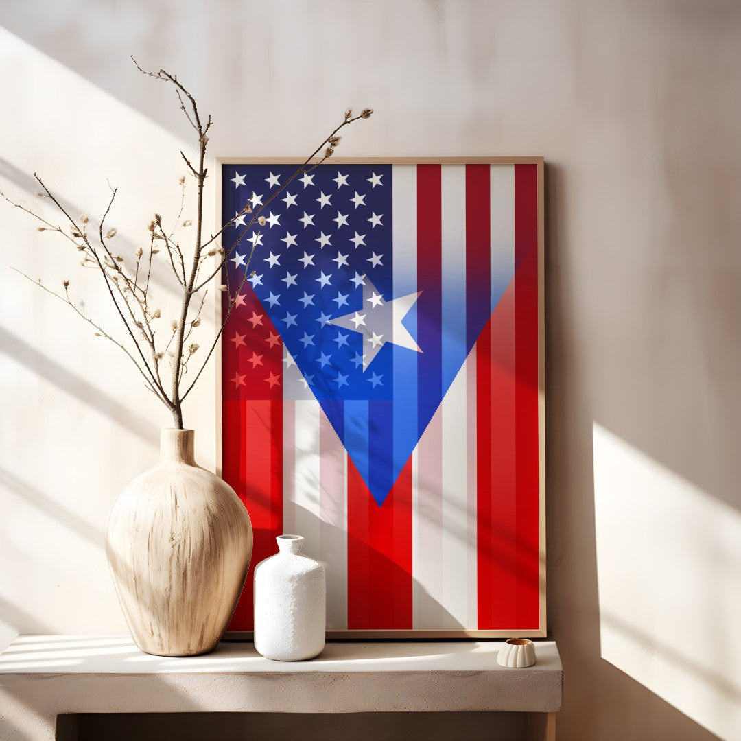 Introduction – Celebrate dual heritage with a digital artwork that seamlessly fuses the United States flag with the iconic Puerto Rican emblem. Perfect for posters, prints, and social graphics that honor heritage.