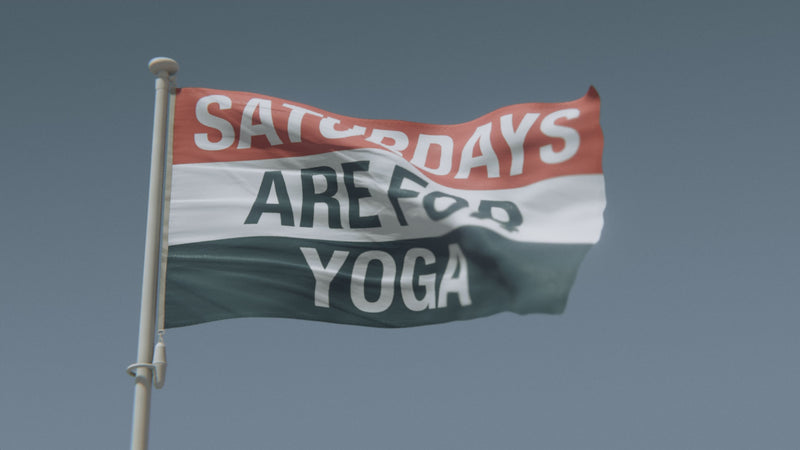 - Design: Red, white, and navy horizontal bands with bold white typography reading “SATURDAYS ARE FOR YOGA” as shown in the product image.