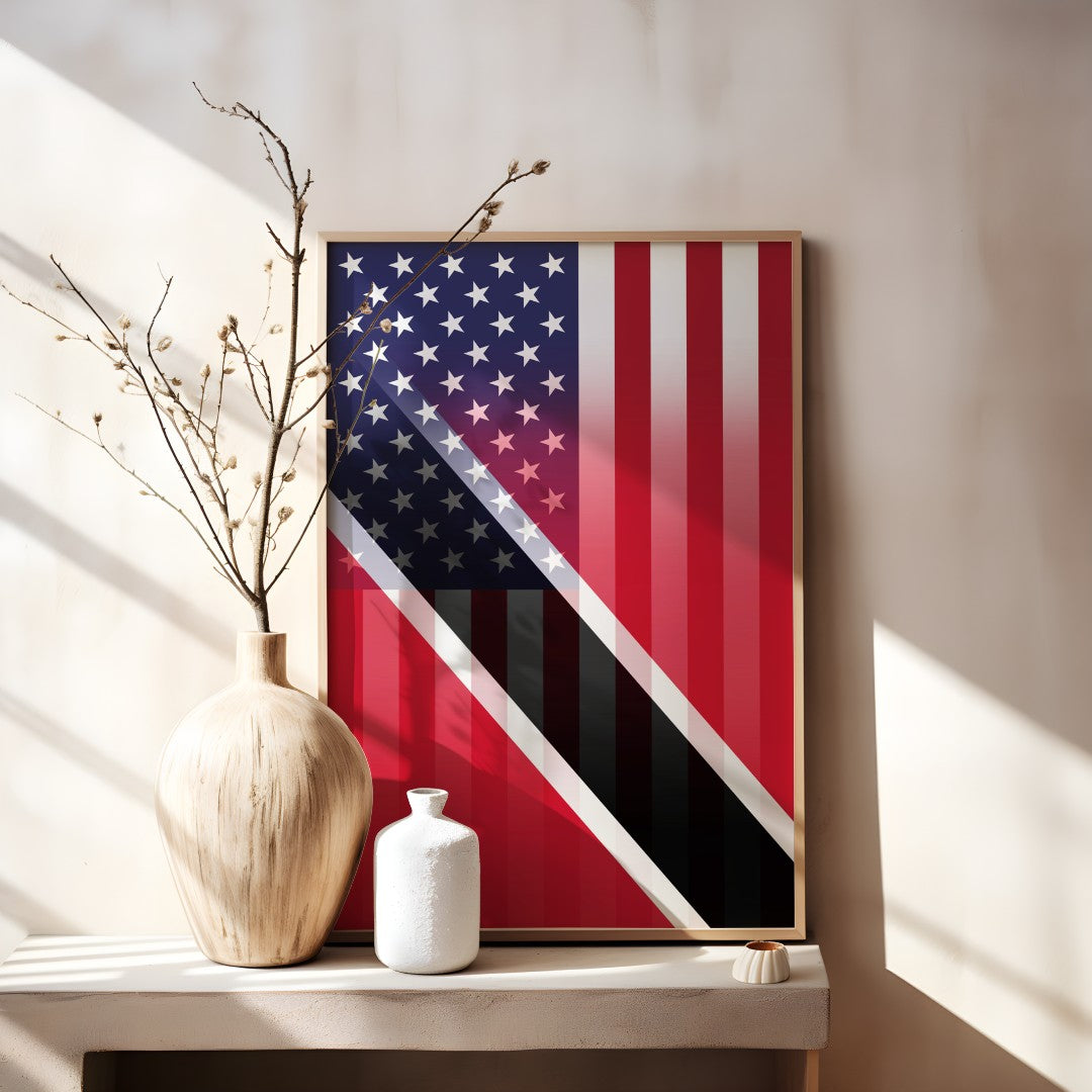 Trini American Flag Design is a digital artwork from Bannerfi that blends the stars and stripes of the United States with the bold diagonal emblem of the Trinidad and Tobago flag. Visually, the composition merges the US star field with a red field accented by a white-edged black diagonal stripe, creating a striking celebration of dual heritage. This high-quality JPEG is ideal for posters, prints, and social graphics, and is delivered as an instant download from Bannerfi's digital artwork collection. It is categorized under Software > Digital Goods & Currency > Digital Artwork.