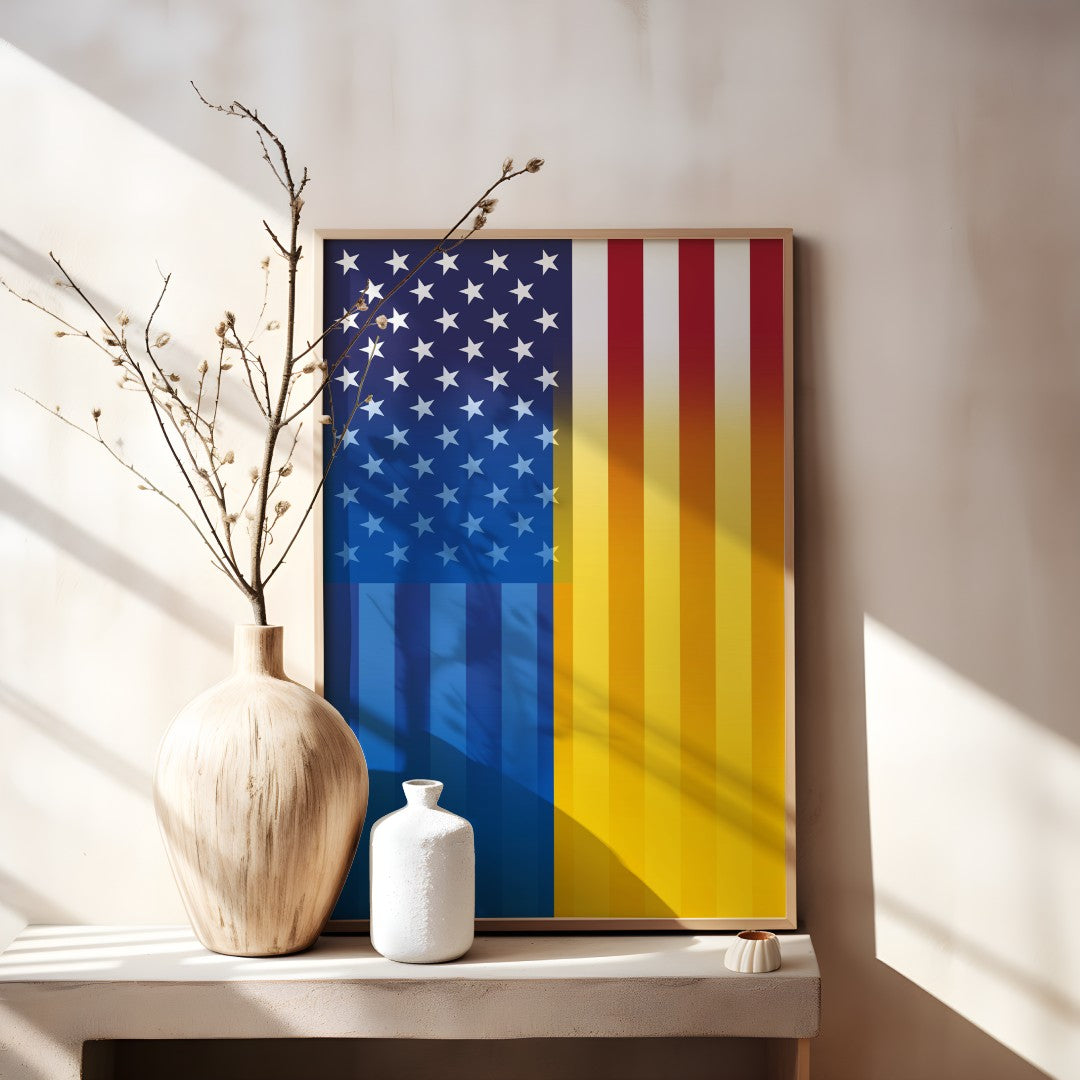- Design note: A seamless fusion of the US flag elements with the Ukrainian color palette in a single cohesive composition
