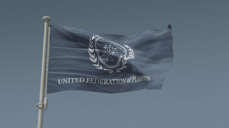 - Design: Deep blue field with the United Federation of Planets emblem framed by a laurel motif and the federation name prominently displayed.