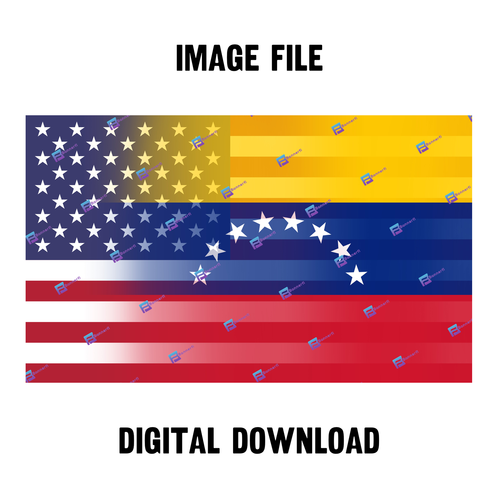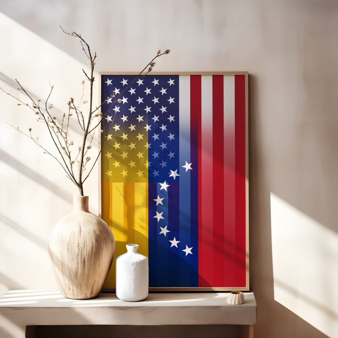 Celebrate dual heritage with a digital artwork that blends the United States flag’s stars and stripes with the bold color blocks of the Venezuelan flag into a single, cohesive design. Perfect for posters, prints, social graphics, and gifts.